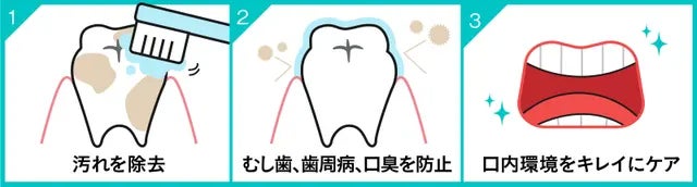 歯周炎(歯槽膿漏)の予防、歯肉(齦)炎の予防、口臭の防止、タバコのやに除去、歯を白くする、口中を浄化する、口中を爽快にする、むし歯を防ぐ。