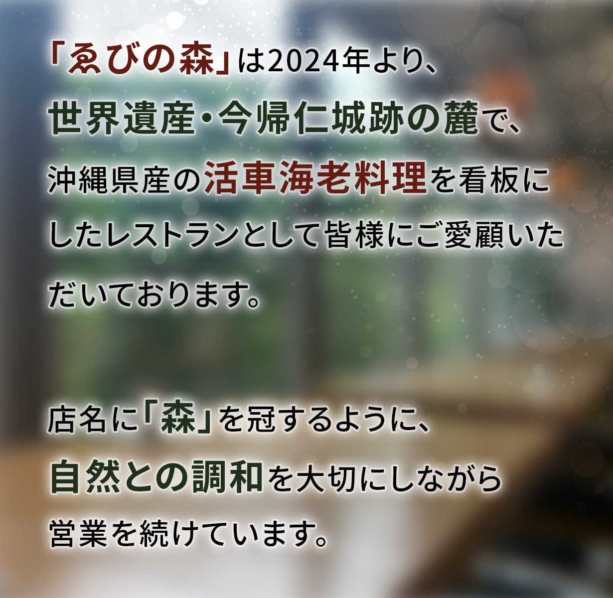 「ゑびの森」は、お陰様で多くのお客様にご来店いただき、活海老料理を通じて沖縄の魅力をお伝えしてきました。