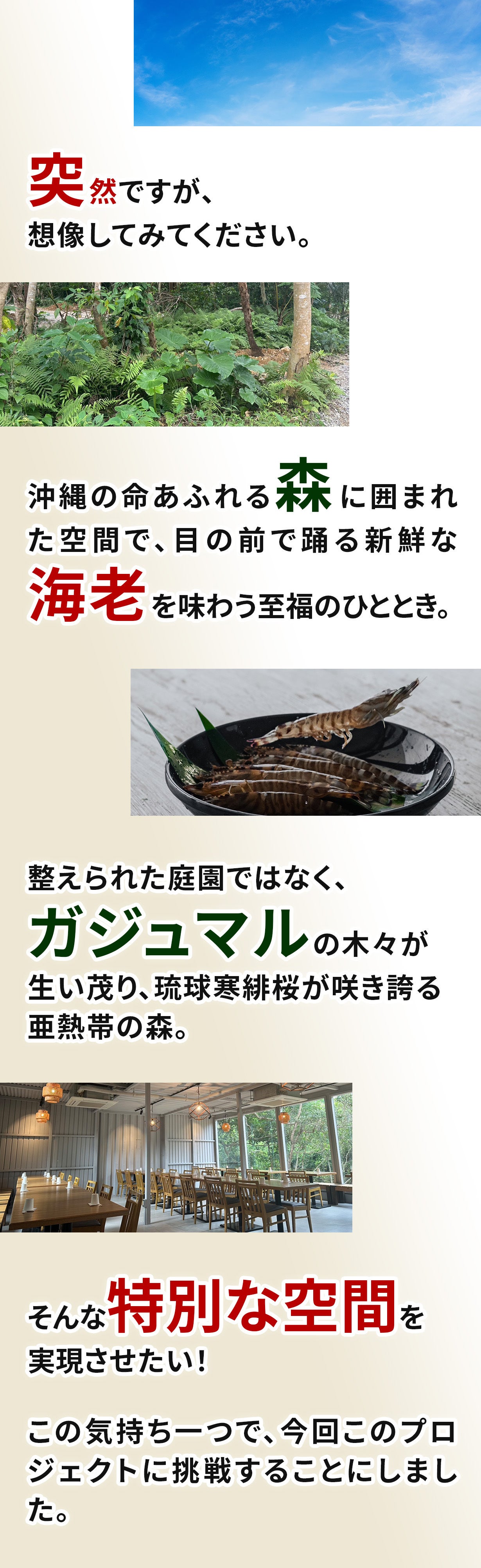 「今帰仁村の森の中で、沖縄の豊かな食材と自然を存分に味わっていただける空間を作り上げたい」