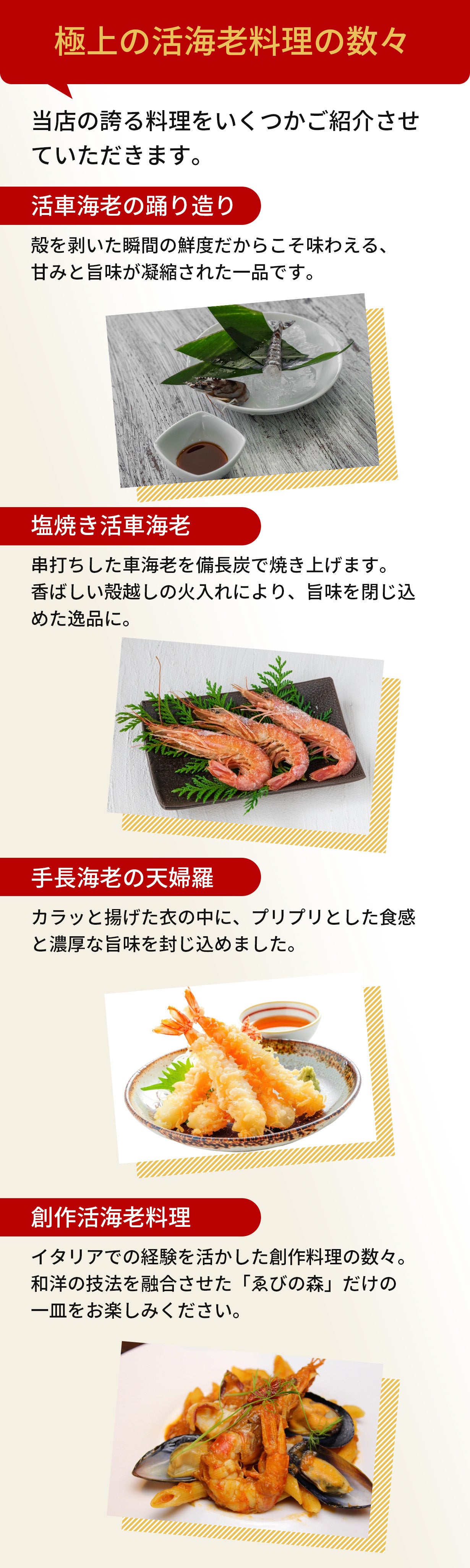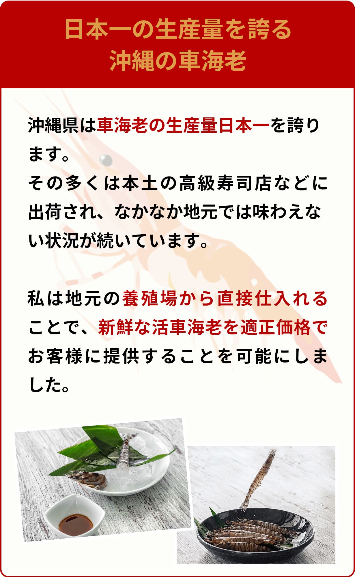 当店では地元の養殖場から直接仕入れることで、最高品質の活車海老を適正価格で提供。