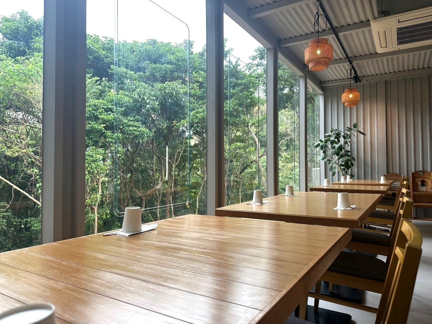 店内からは四方を緑に囲まれた景色が広がり、まるで森の中でお食事をしているような非日常的な空間があります。