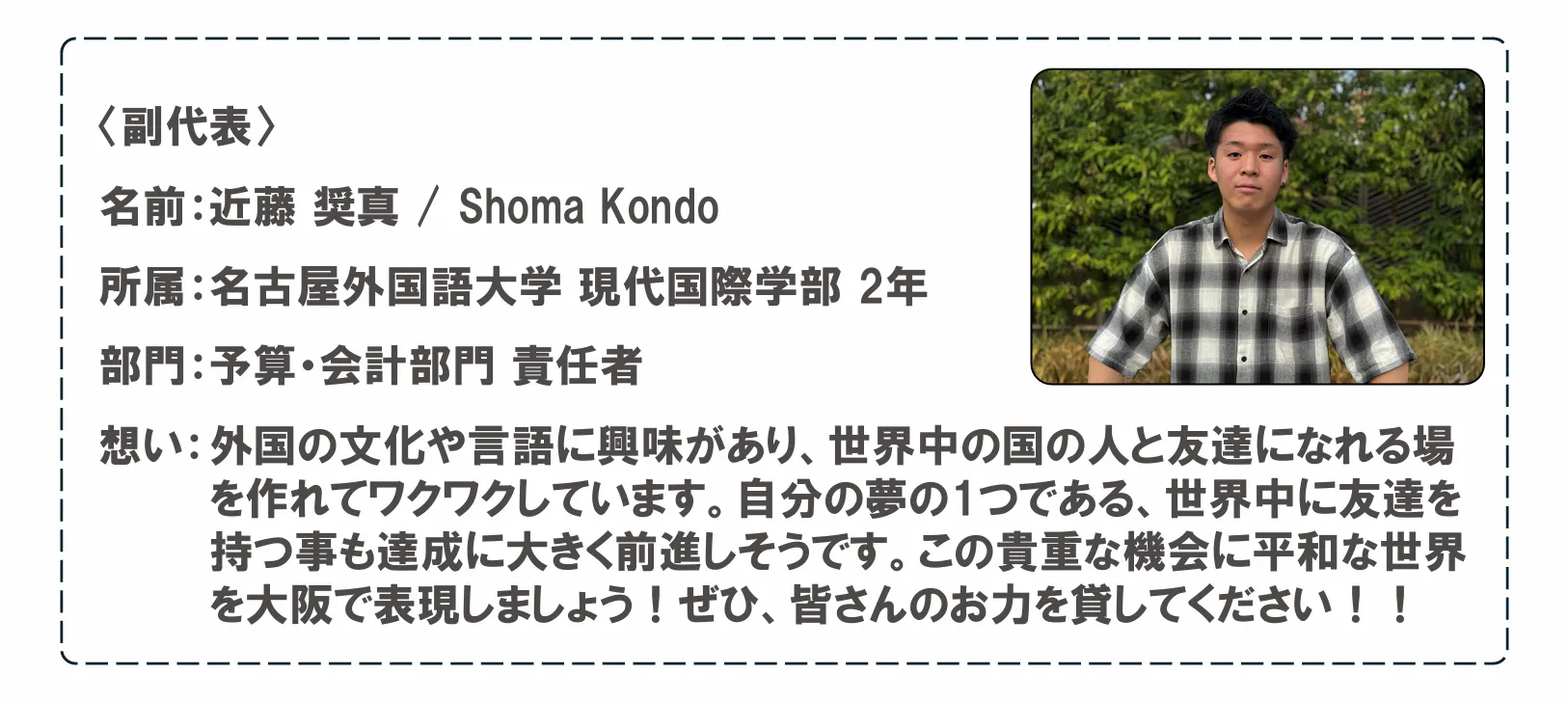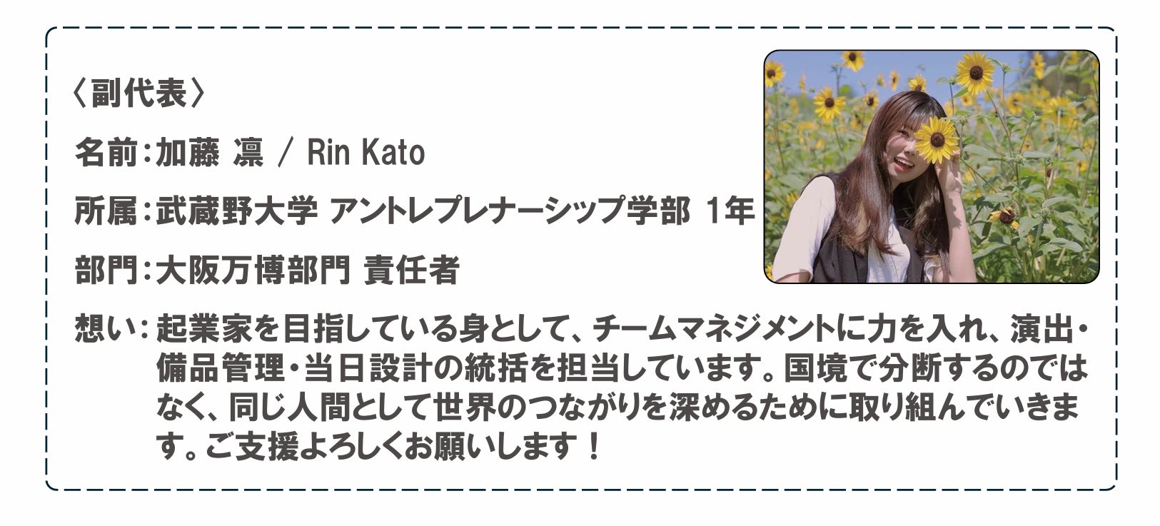 本プロジェクトは、私が手掛けた「あの夏を取り戻せプロジェクト」を基盤としています。この活動では、コロナ禍で失われた青春を取り戻す機会を提供しました。その経験をもとに、今回は「コロナで分断された世界を、大阪・関西万博を通じて一つにしたい」との想いからプロジェクトを立ち上げました。