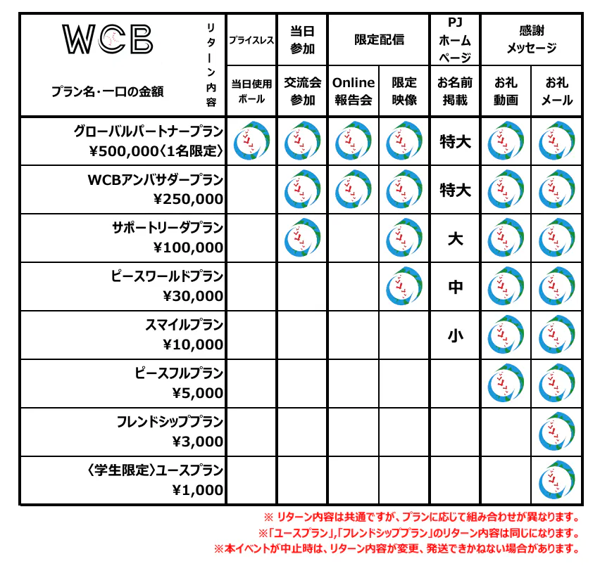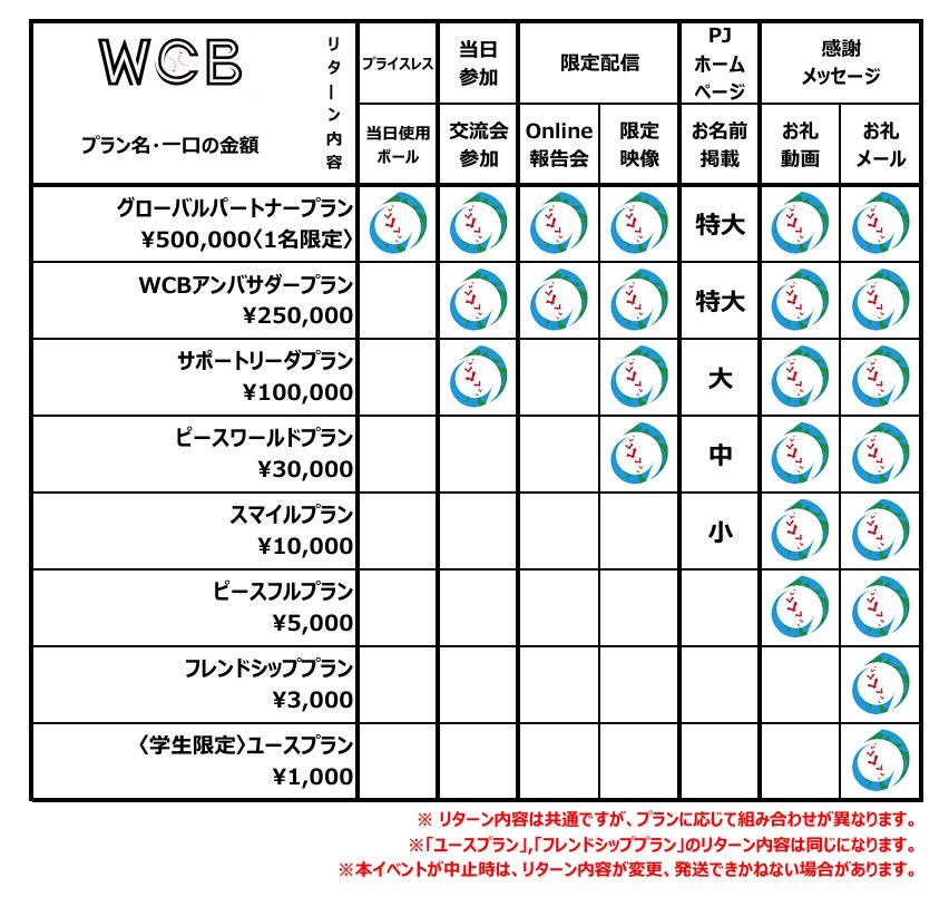 「世界キャッチボールプロジェクト」を応援していただいてる方向けの特典です。WCBプロジェクト公式ホームページにて支援者様のお名前を支援金額別に掲載させていただきます。