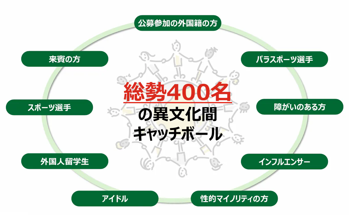 イベント当日、円周2キロに及ぶ大屋根リングに400人が一人5メートル間隔で並び、リレー形式でキャッチボールをつないでいきます。この壮大な光景は、国籍や文化を超えた「つながり」の象徴となり、スポーツを通じた交流の場を創出します。