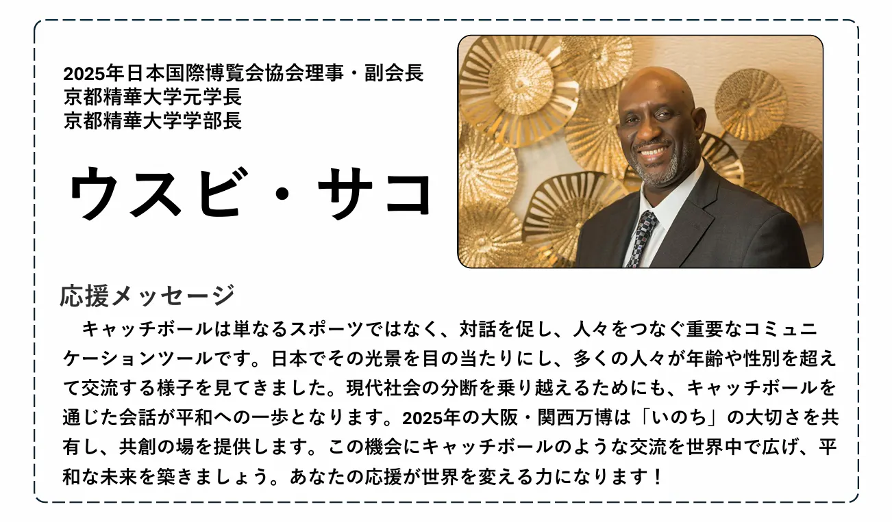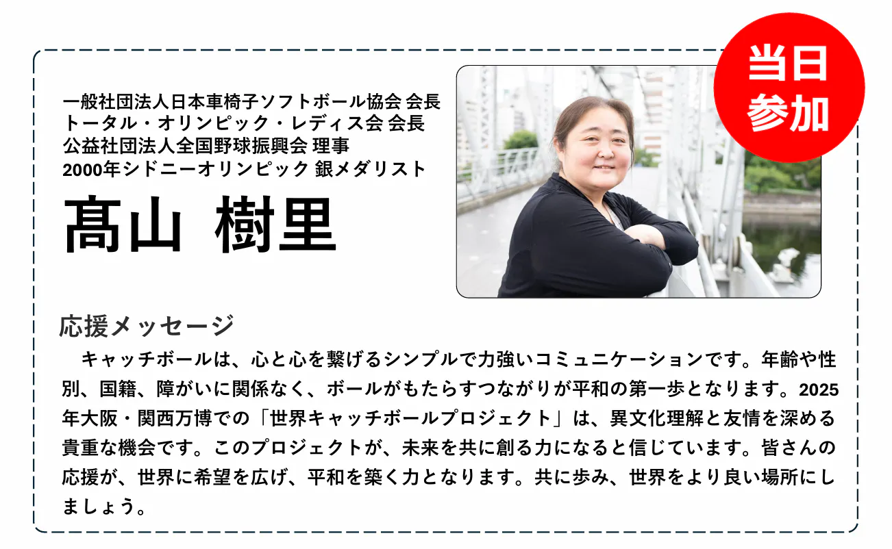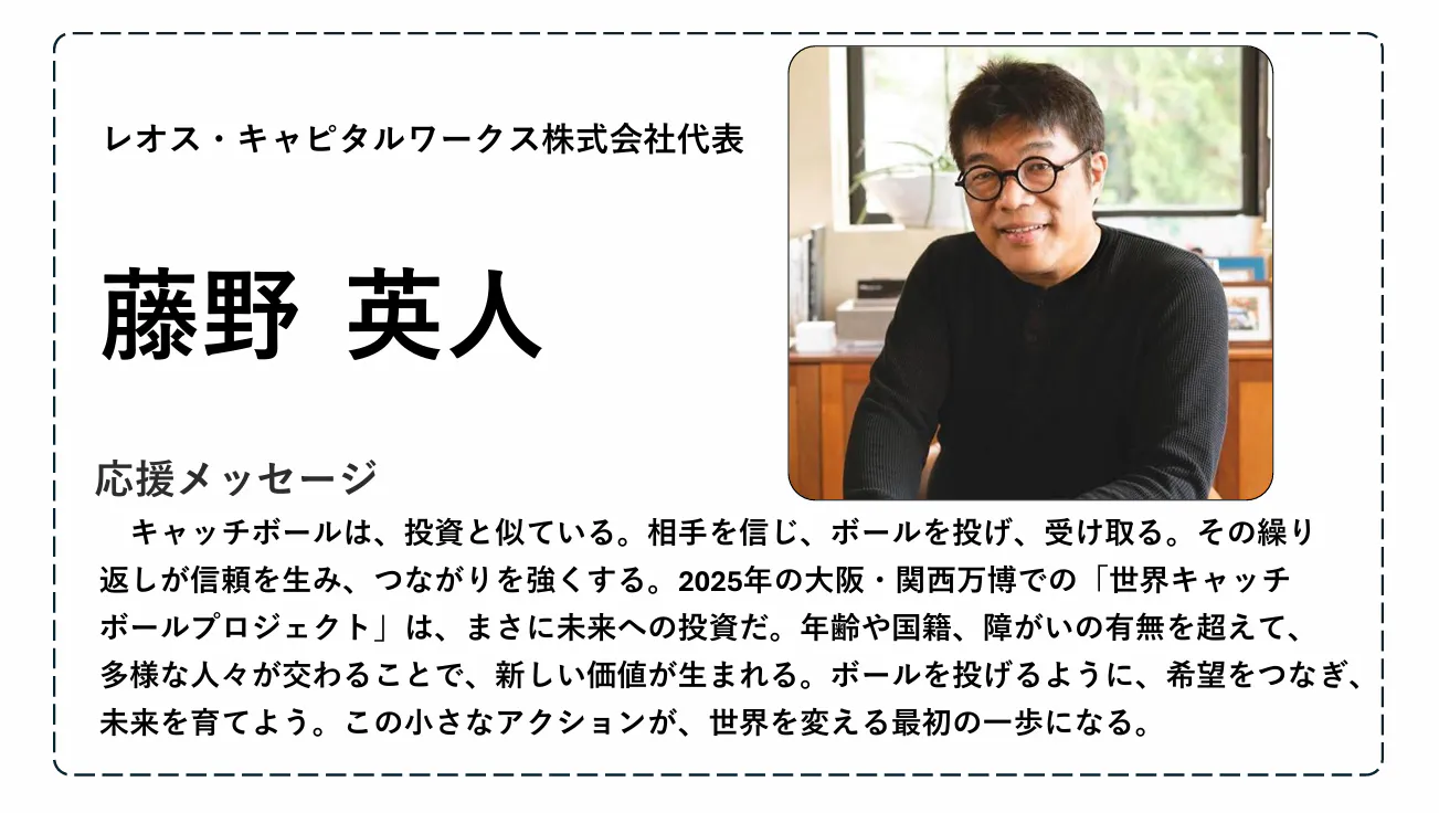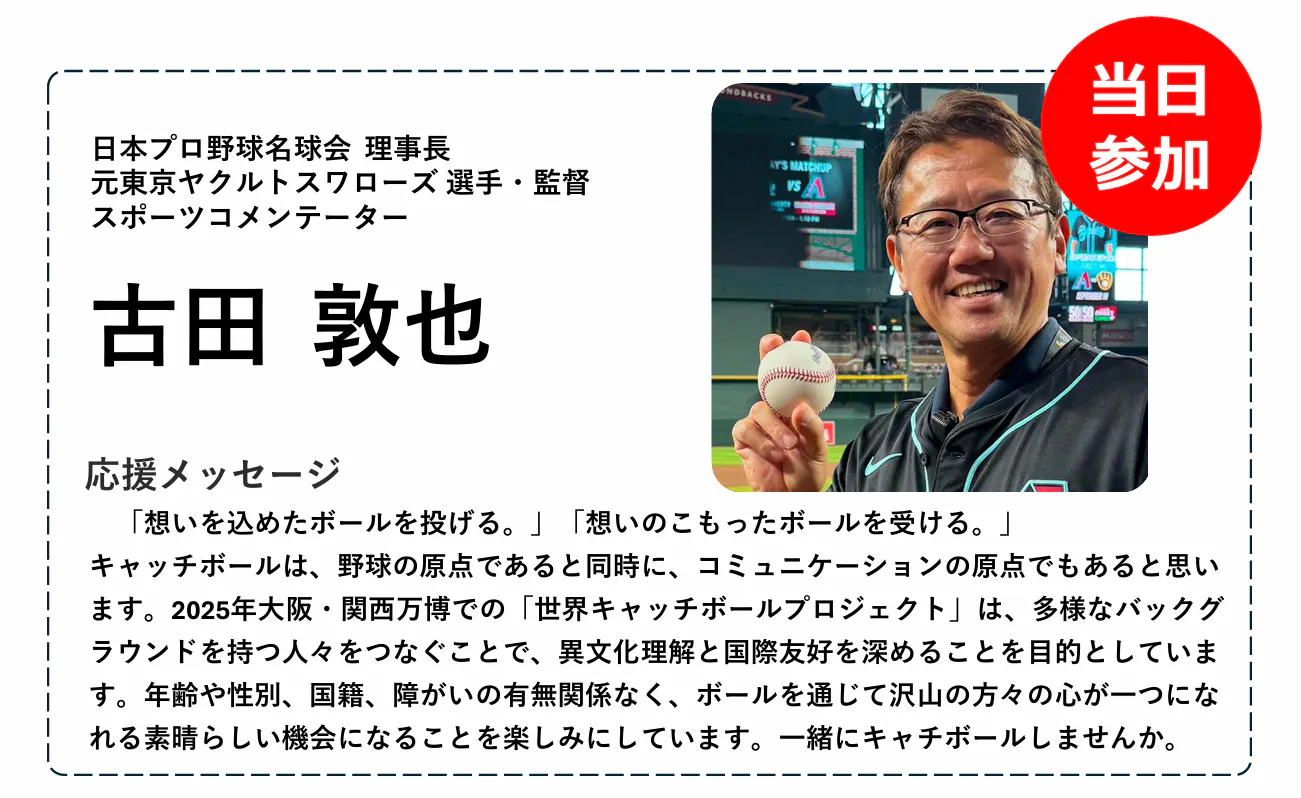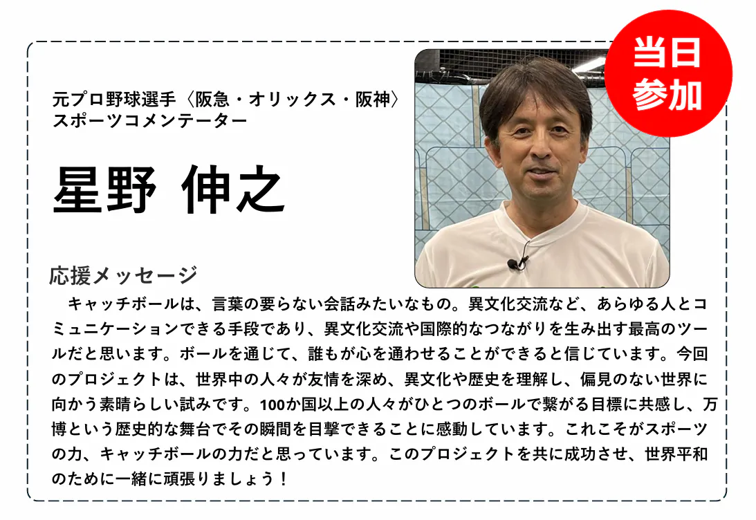 また、本プロジェクトには多くの方々から応援をいただいており、元プロ野球選手の古田敦也さん、星野伸之さんをはじめとする、多くのアスリート、メダリストの方々からも力強い応援メッセージを受け取っています。さらに、イベントへの参加を決定している著名人もおり、世界とつながる場を共に創り上げていきます。今後もさらなる応援メッセージをいただく予定です。応援メッセージの詳細についてはWCB公式HPにて記載していますので、ぜひご覧ください!