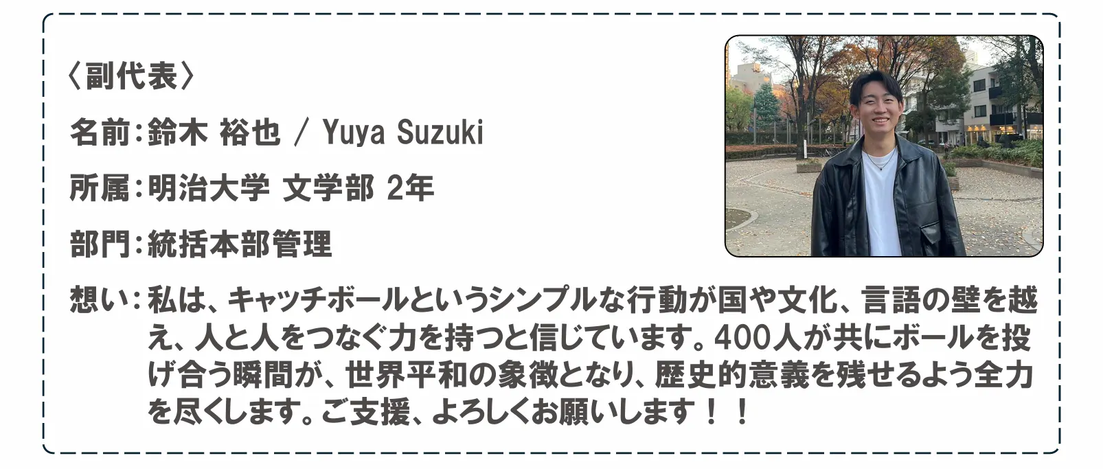 キャッチボールは、言葉を使わずに人と心を通わせる力があります。私自身、話すのが苦手だった頃にキャッチボールを通じて他者とつながり、”TOMODACHI”になれた経験があります。だからこそ、国や人種、宗教の壁を越えて、キャッチボールを通じて世界中の人々が理解し合い、尊重し合う文化を広めたいと考えています。