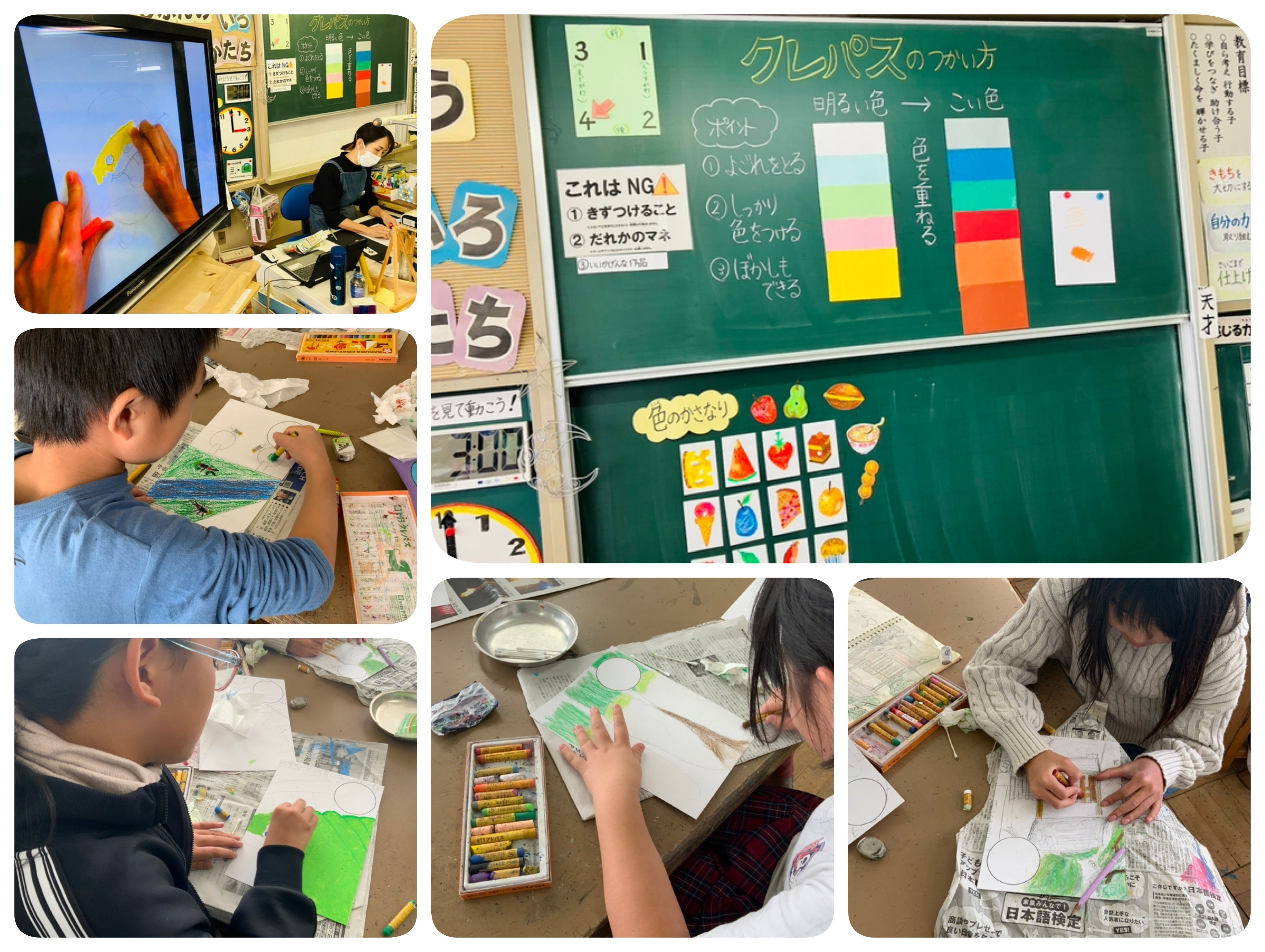 クレパスの使い方を図工の先生に教わって、下絵に、色がはっきりするように、力強く塗りました。綿棒を使って、「ぼかし」を入れ、あじのある作品になりました。