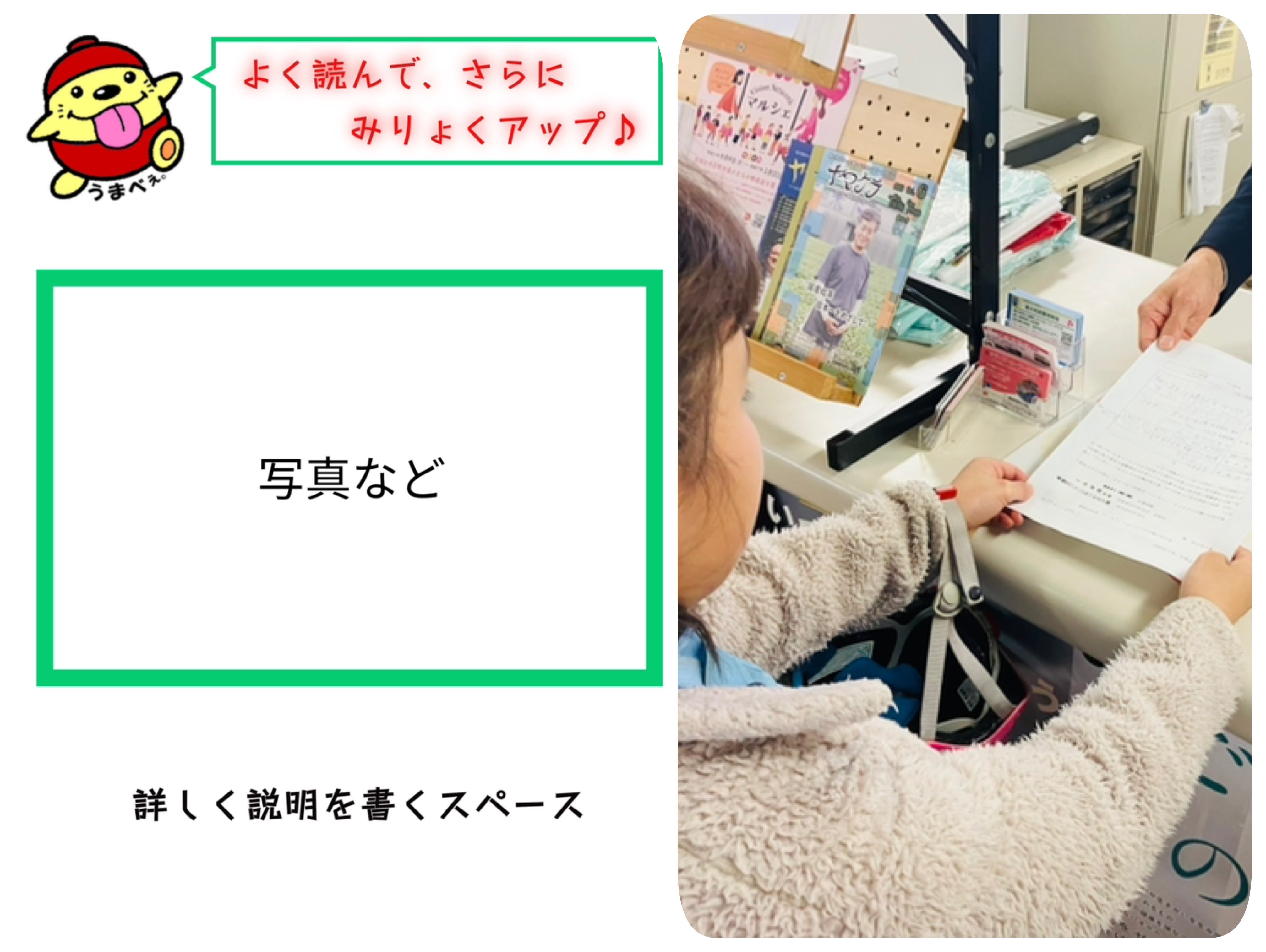 東大和市のキャラクターである「うまべぇ」。そのイラストを説明ページで使うために、東大和市役所に使用許可申請書を提出に。