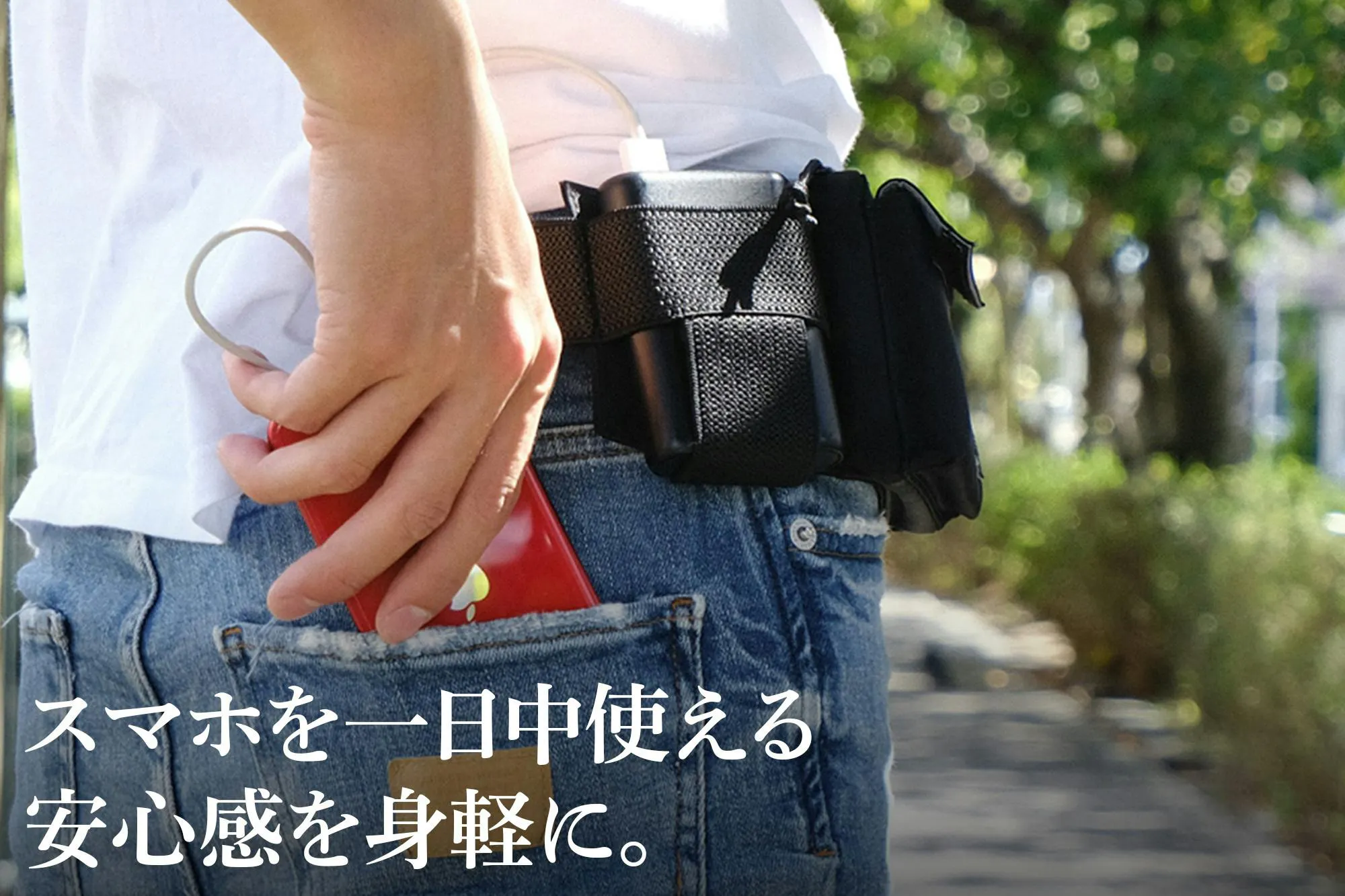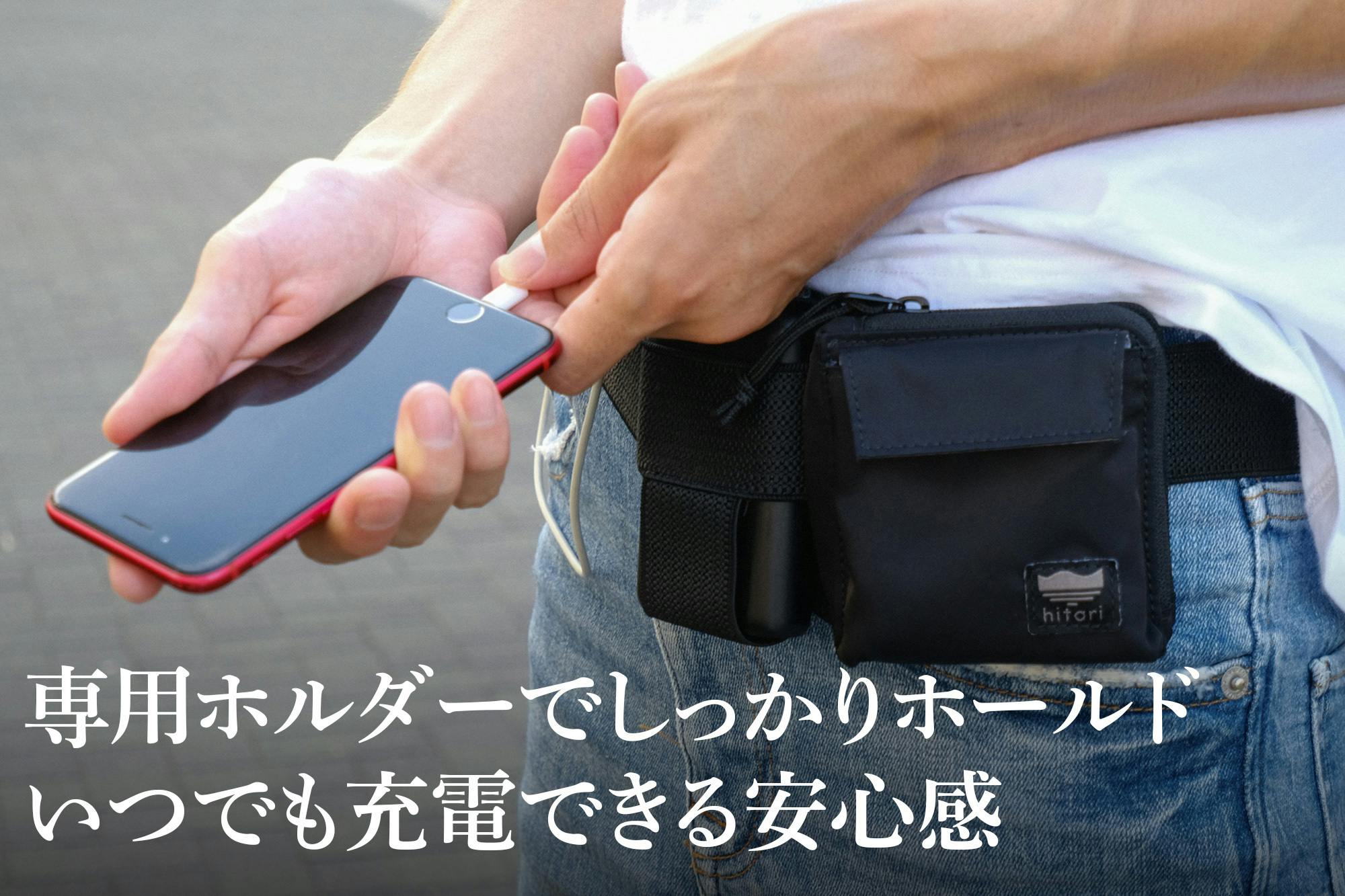 モバイルバッテリーがピッタリ収まる専用ホルダーが付いているので、長時間の屋外イベントも安心。