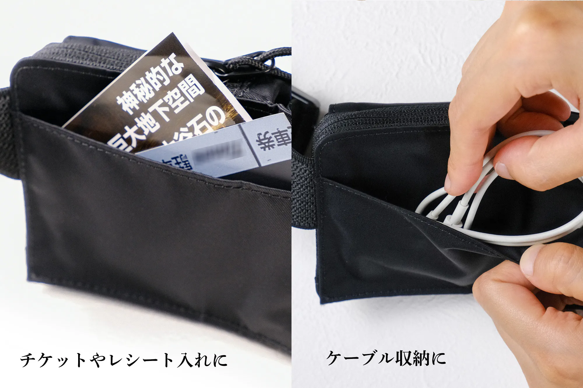 左右どちらのポケットにスマホを入れてもコードを綺麗にまとめて充電できます。