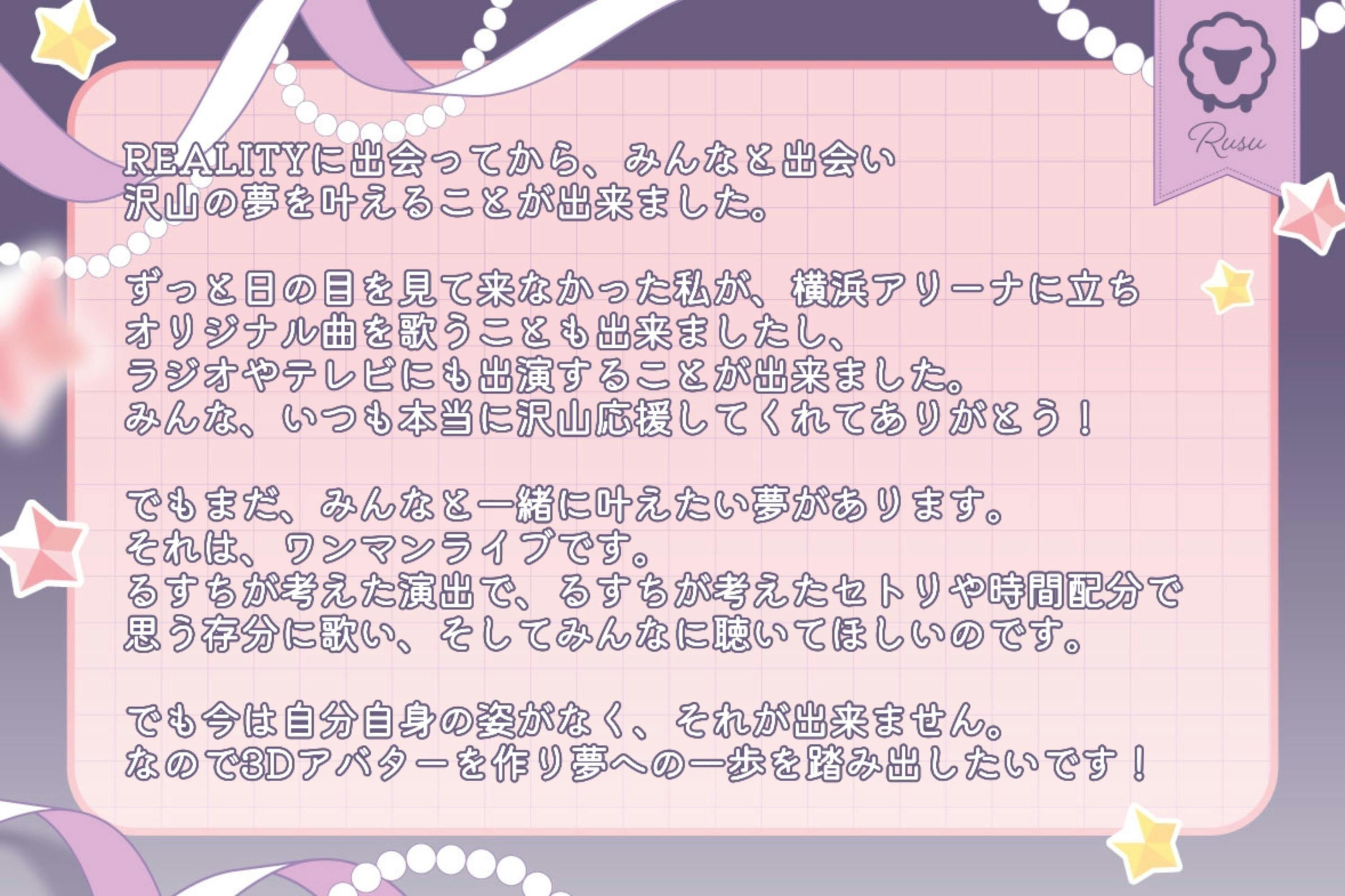 このプロジェクトは私にとって、新たな挑戦であり、長年の夢の実現でもあります。皆様の温かいご支援をいただければ、3Dアバターを通じて、より多くの方々に夢や感動をお届けできると確信しています。るすちと一緒に、この新しいステージを創り上げていくことにご賛同いただけましたら幸いです。どうぞよろしくお願いいたします。