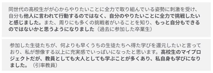 ■過去にマイプロジェクトアワードに参加した高校生や引率の先生方の声