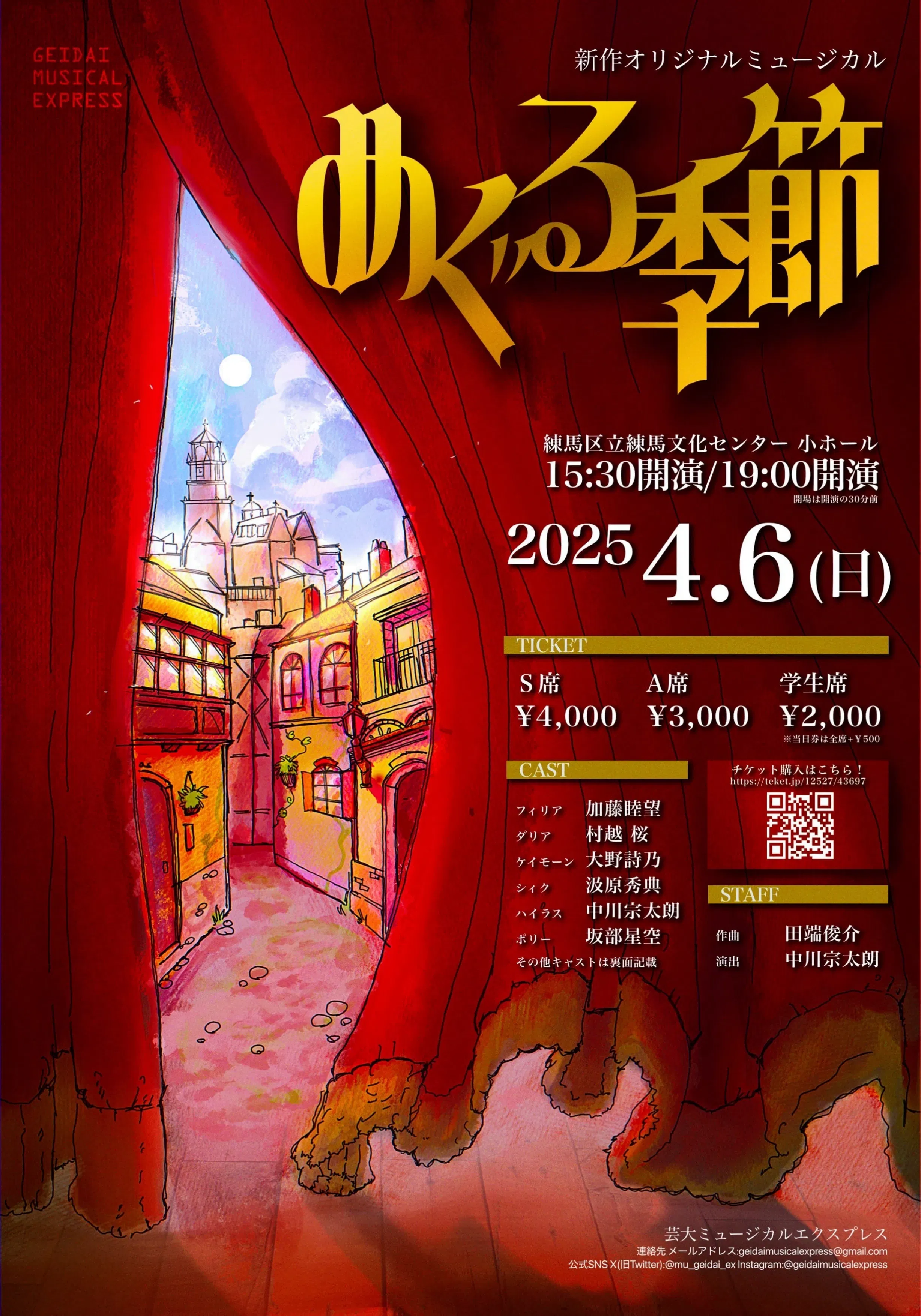 チケット料金: S席 ¥4,000 / A席 ¥3.000 / 学生席 ¥2,000(当日券は+¥500)