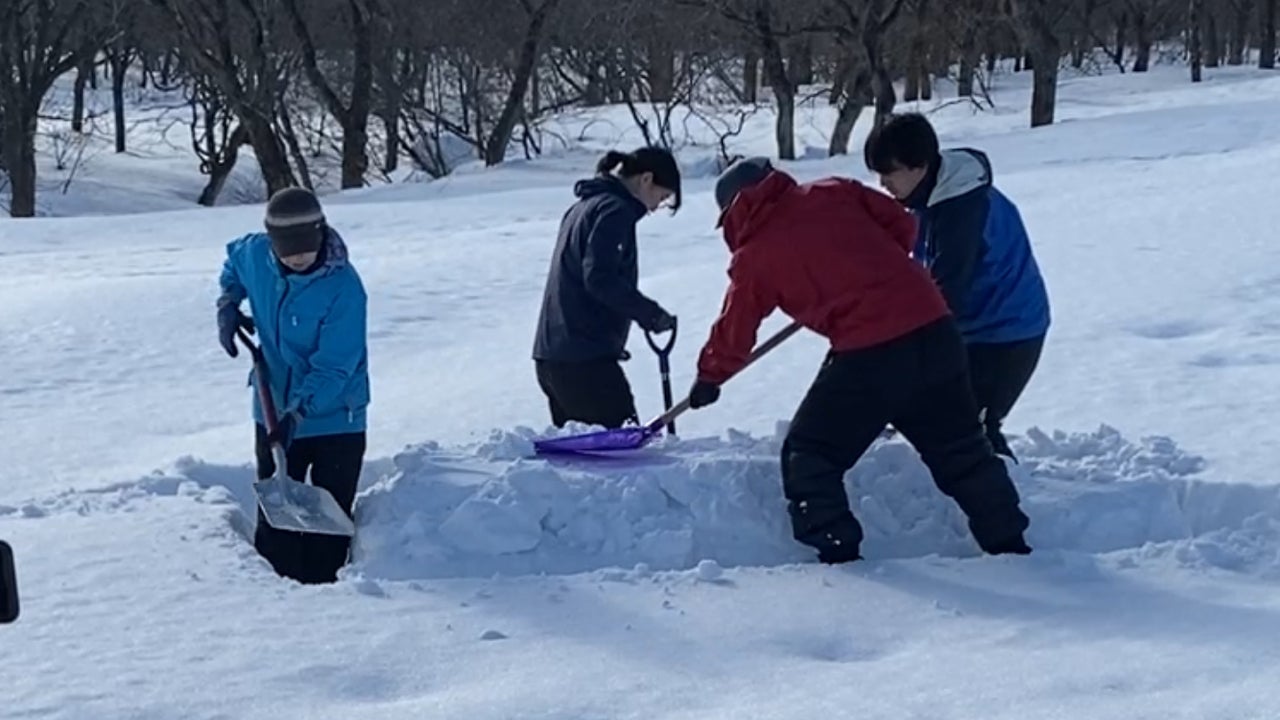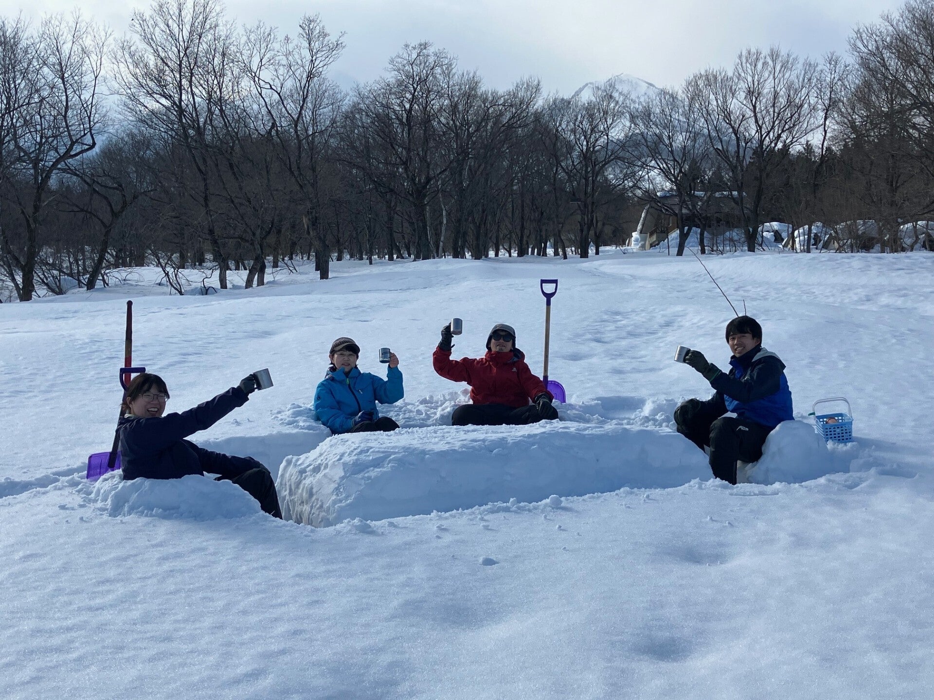 現在、整備予定地は約2mの積雪があります。せっかく天気も良いし雪もたくさんあるので温かいココアを飲みながら、ミーティングを行いました。雪を見ながら話し合うと斬新なアイデアが生まれるかもしれませんね!