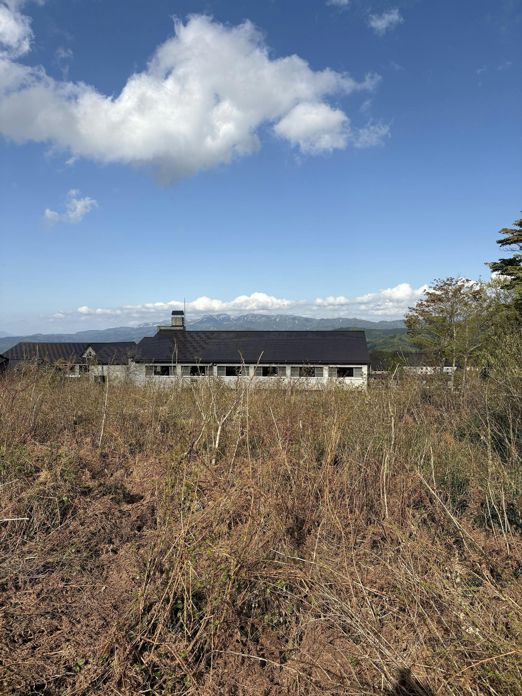活動広場「ピエニ メッツァ」整備予定地の雪が、すっかり解けて無くなりました。5月7日現在の様子です。雪に押されて草木が倒れ、茶色い所が予定地です。