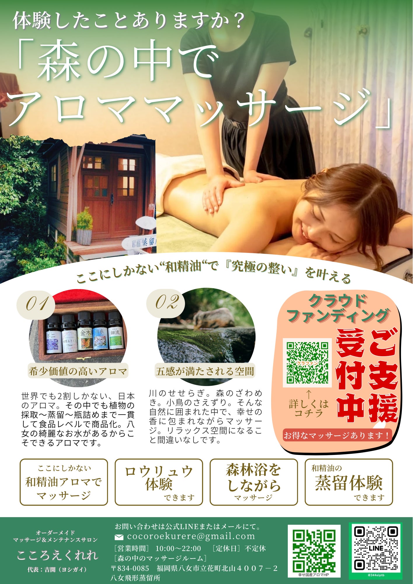 和精油には、私たちの心と体に深い影響を与える力があります。その力を最大限に体感できる場所を作りたい、またサロンを経営されるたくさんのオーナー様がこの場所で施術をしたい、また受けてみたいという想いから、このプロジェクトは始まりました。八女飛形蒸留所は、豊かな自然に囲まれた場所にあり、和精油の特性を最大限に引き出すには最適な環境です。現代社会では、忙しさやストレスで心の余裕をなくしてしまうことが多いですが、私たちはこのプロジェクトを通じて、少しでも日常に癒しを提供し、皆様の生活がより豊かになることを願っています。