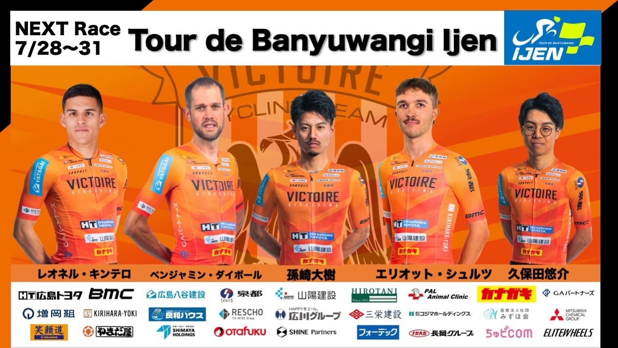 2025/08/01 18:10このたびはヴィクトワール広島への温かいご支援を誠にありがとうございます。皆さまのサポートのおかげで、7月28日〜31日にインドネシア・バニュワンギ県で開催されたUCIレース 「ツール・ド・バニュワンギ・イジェン」 に孫崎、ベンジャミン、エリオット、レオネル、久保田の5名で挑戦することができました。海外ならではの厳しい山岳や突然のスコールの中、チーム一丸となって4日間を走り抜けた各ステージの結果をご報告いたします。【ツール・ド・バニュワンギ・イジェン(7月28日〜31日)】第1ステージ(約140km)序盤からアタックが続くハイスピード展開。ヴィクトワール広島は孫崎、久保田が積極的に動き、後半はベンジャミン、エリオットが先頭集団に入りました。最終盤に5名の抜け出しには乗れず、ベンジャミンが17位でチーム最高位となりました。順位17位 ベンジャミン・ダイボール18位 エリオット・シュルツ61位 久保田 悠介69位 レオネル・キンテロ79位 孫崎 大樹第1ステージ レース詳細【https://victoirehiroshima.com/news/20250728.shtml】第2ステージ(約145km)序盤は落ち着いた展開でしたが、レース中盤に豪雨が襲い、過酷な状況に。久保田が集団を牽引し、孫崎、ベンジャミン、エリオットが先頭集団に残りました。最後は集団スプリントとなり、孫崎が堂々の5位入賞を果たしました。順位5位 孫崎 大樹11位 エリオット・シュルツ18位 ベンジャミン・ダイボール40位 レオネル・キンテロ89位 久保田 悠介第2ステージ レース詳細【https://victoirehiroshima.com/news/20250729.shtml】第3ステージ(山岳140km)本格的な山岳ステージがスタート。レース後半の登りでヴィクトワールが集団先頭に立ち、エリオットは山岳ポイントを4位通過しました。終盤は20名ほどに絞られた先頭集団で勝負となり、エリオットが8位、ベンジャミンが13位でゴールしました。順位 8位 エリオット・シュルツ13位 ベンジャミン・ダイボール69位 孫崎 大樹80位 レオネル・キンテロ88位 久保田 悠介第3ステージ レース詳細【https://victoirehiroshima.com/news/20250730.shtml】第4ステージ(最終日・山岳150km)最終日は標高1880mを登る山岳ステージ。孫崎・久保田を中心に集団をコントロールし、最後は小集団での登坂勝負となりました。エースのベンジャミンが7位でフィニッシュし、総合順位でも9位にランクイン。4日間の遠征を締めくくりました。順位7位 ベンジャミン・ダイボール37位 エリオット・シュルツ38位 レオネル・キンテロ62位 孫崎 大樹81位 久保田 悠介第4ステージ レース詳細【https://victoirehiroshima.com/news/20250801.shtml】この度は、ご支援・ご声援誠にありがとうございました。これからも全力でレースを戦っていきますので、ご声援の程よろしくお願い致します。 もっと見る