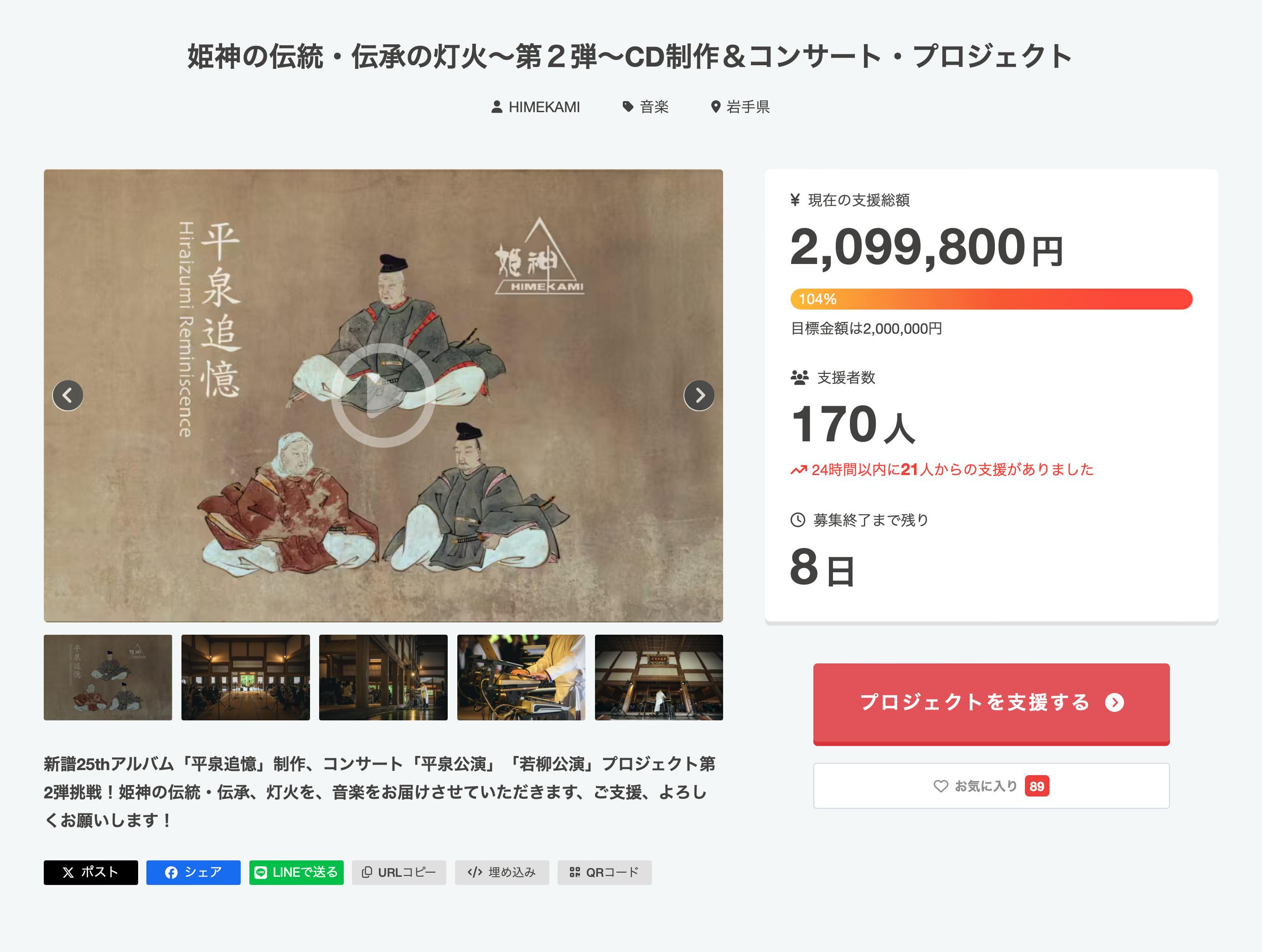 プロジェクトをご支援いただいた皆様2025/1/23(木)21時、プロジェクトの目標を達成する事ができました、ご支援いただきました皆様、心より篤く御礼申し上げます!募集終了の1/31(金)まで残り8日となりました、支援者数200人、お気に入り登録100を目指し、最後まで見守っていただきますよう、よろしくお願いします!!本日のYouTubeライブ配信にてご支援のコメントを読ませていただきました。前プロジェクトからご支援の皆様、今回のプロジェクトをご支援の皆様、応援のメッセージ、心温かいお一人お一人のお言葉、とても胸に沁みております!制作や準備、一つ一つ真心を込めて進めさせていただいております、どうか最後まで応援をよろしくお願いします。姫神/星吉紀