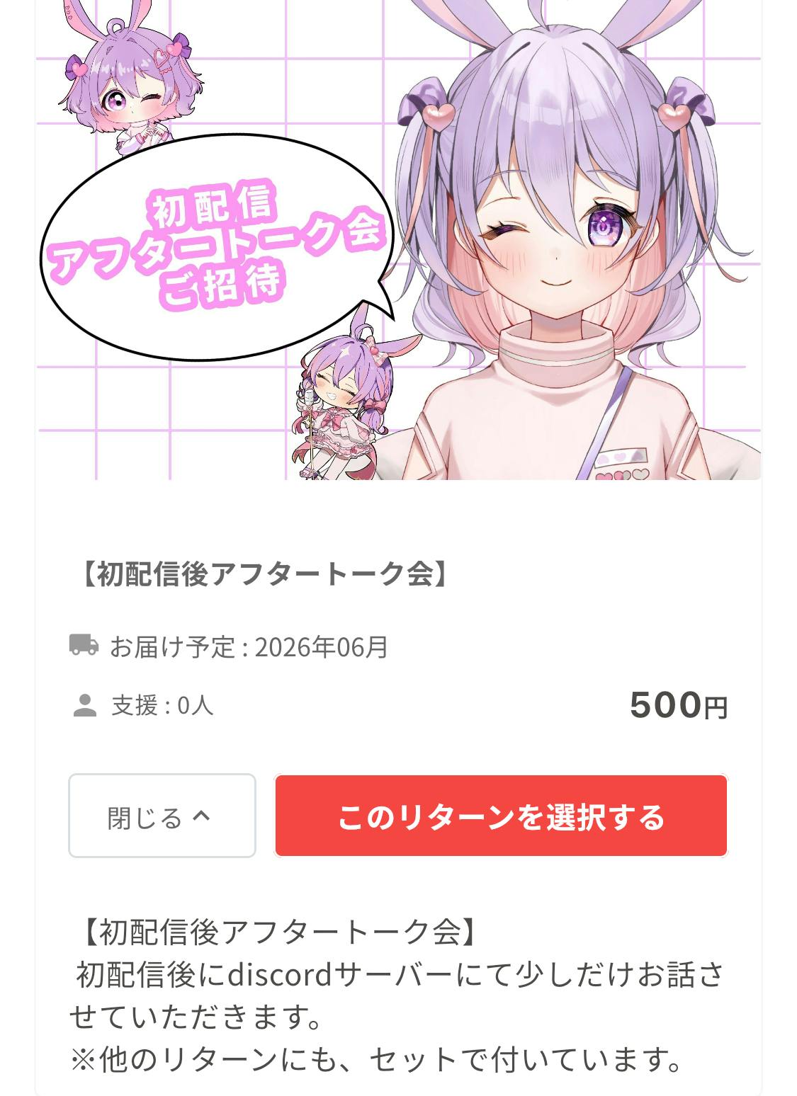 リターンを追加させて頂きました!『初配信アフタートーク会ご招待』Vtuberデビュー初配信後にYouTubeのメンバー限定配信のような形でdiscordにてお話させていただきます。裏話とか感謝とかこれからの事とか、初配信じゃ話せなかったことをお話させていただくのでお楽しみにしてくださいっ※他のプラン全てにセットでついているので、重複して購入しないようにお気をつけください!