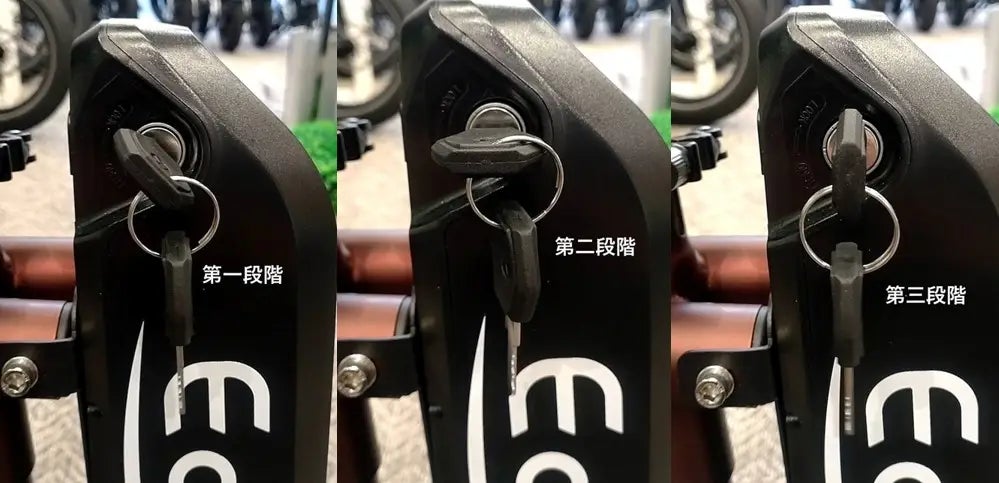 第二段階:バッテリーが車体に固定されますが、内部のロックは解除されず通電しないため、車両を起動できません。この状態で盗難防止対策として、車体の使用やバッテリーの盗難を防ぎます。