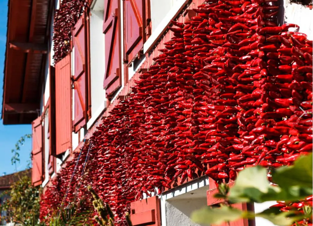 軽井沢胡椒の故郷、フレンチバスクのデスペレット村を秋に訪れると、真っ白な壁にこのピマンデスペレットが干されています。各家庭で、この唐辛子を粉末化し、いろんな料理に使われます。