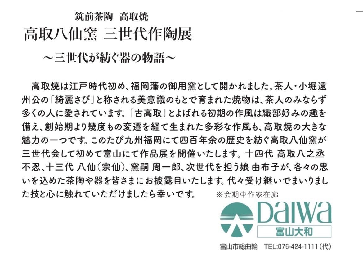 このたび、富山にて「高取八仙窯 三世代作陶展」を開くこととなりました。