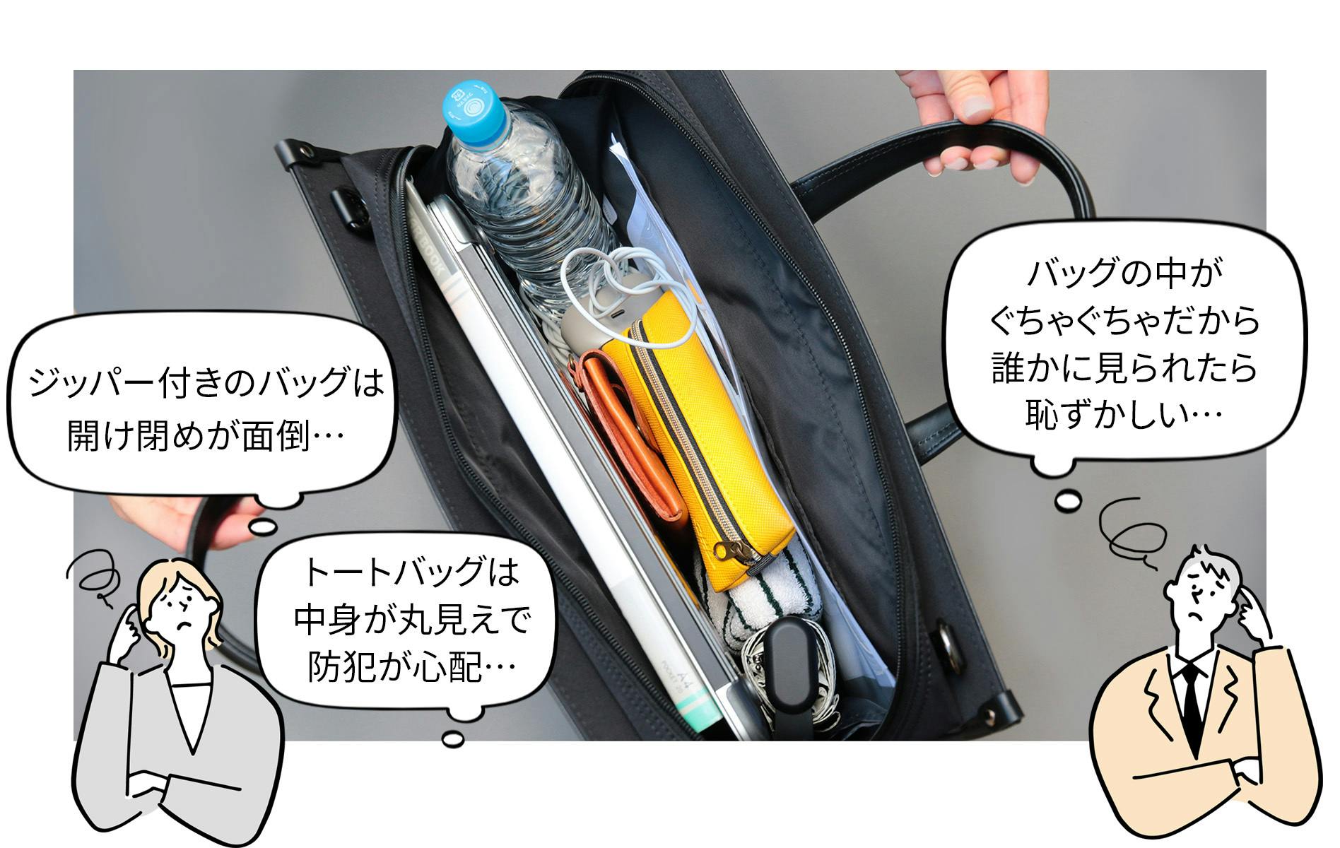 トート型のジッパーなしのバッグは、中身が見えやすく、満員電車だと少し心配に感じたことはありませんか?