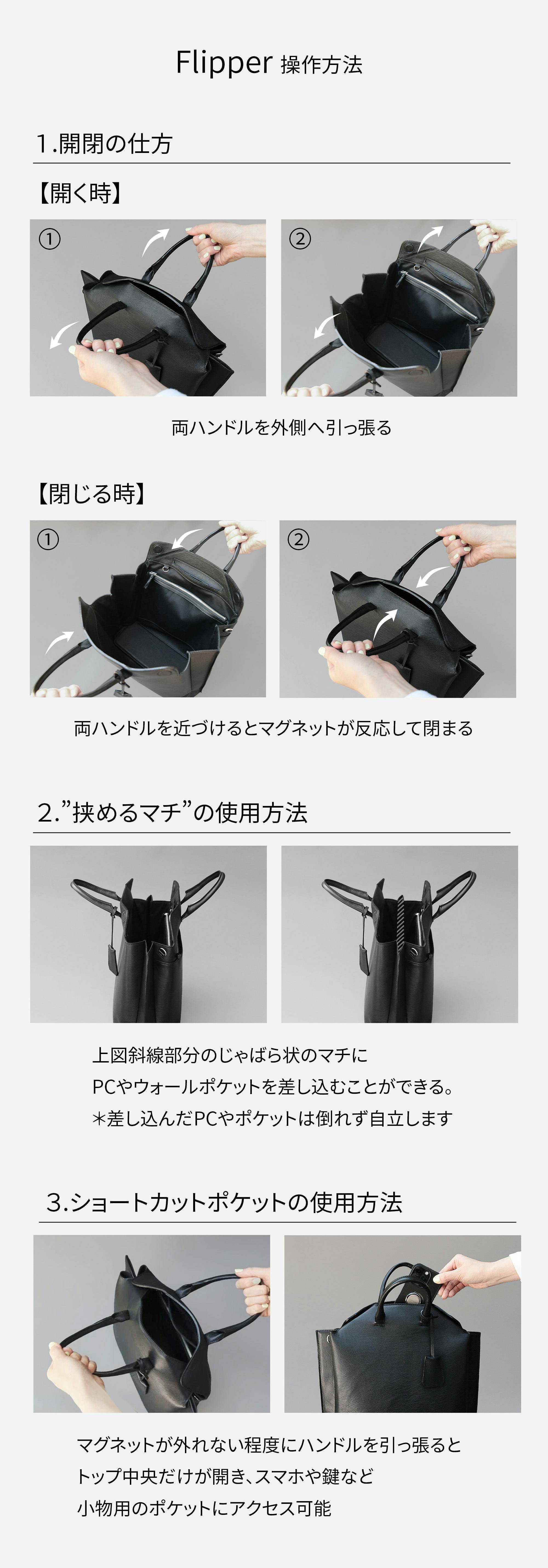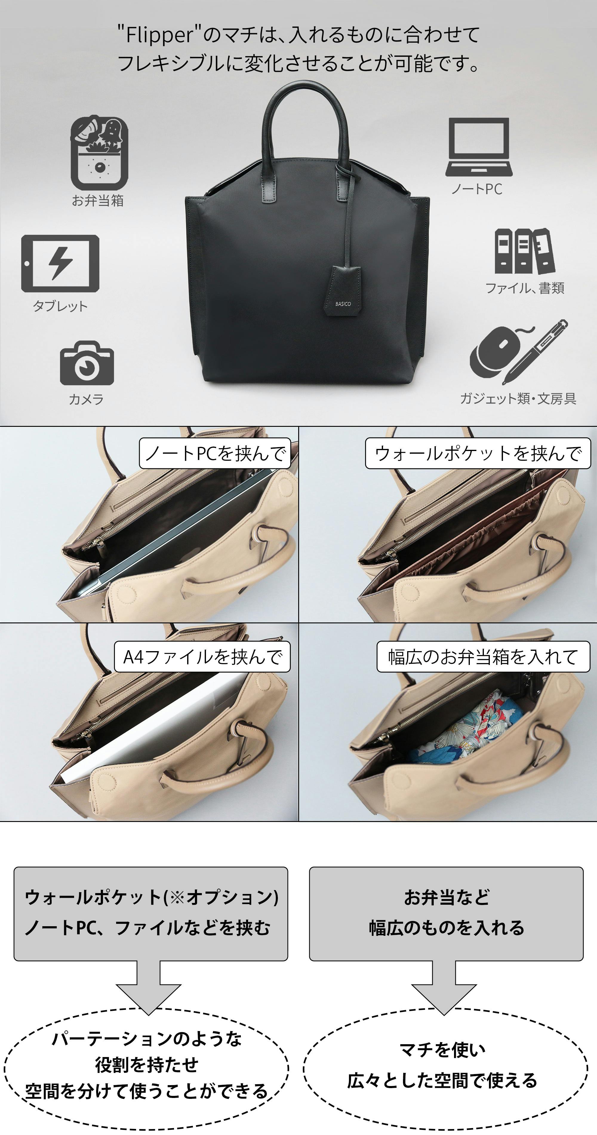 Flipperの大きな特徴のひとつ、【入れたいものに合わせて自在に使う】便利な”挟める”マチ。