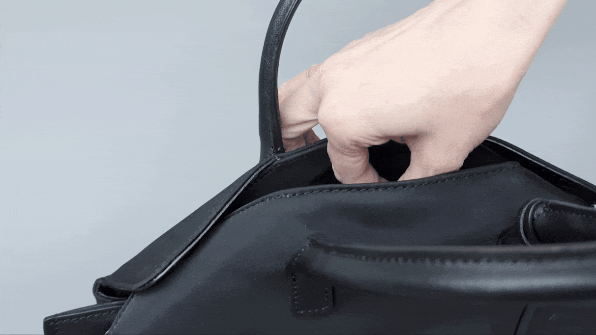 マグネットで閉じた状態でも、バッグを全開にすることなく、中央の隙間から【スマホ】や【鍵】などがすぐに出し入れできるポケットです。