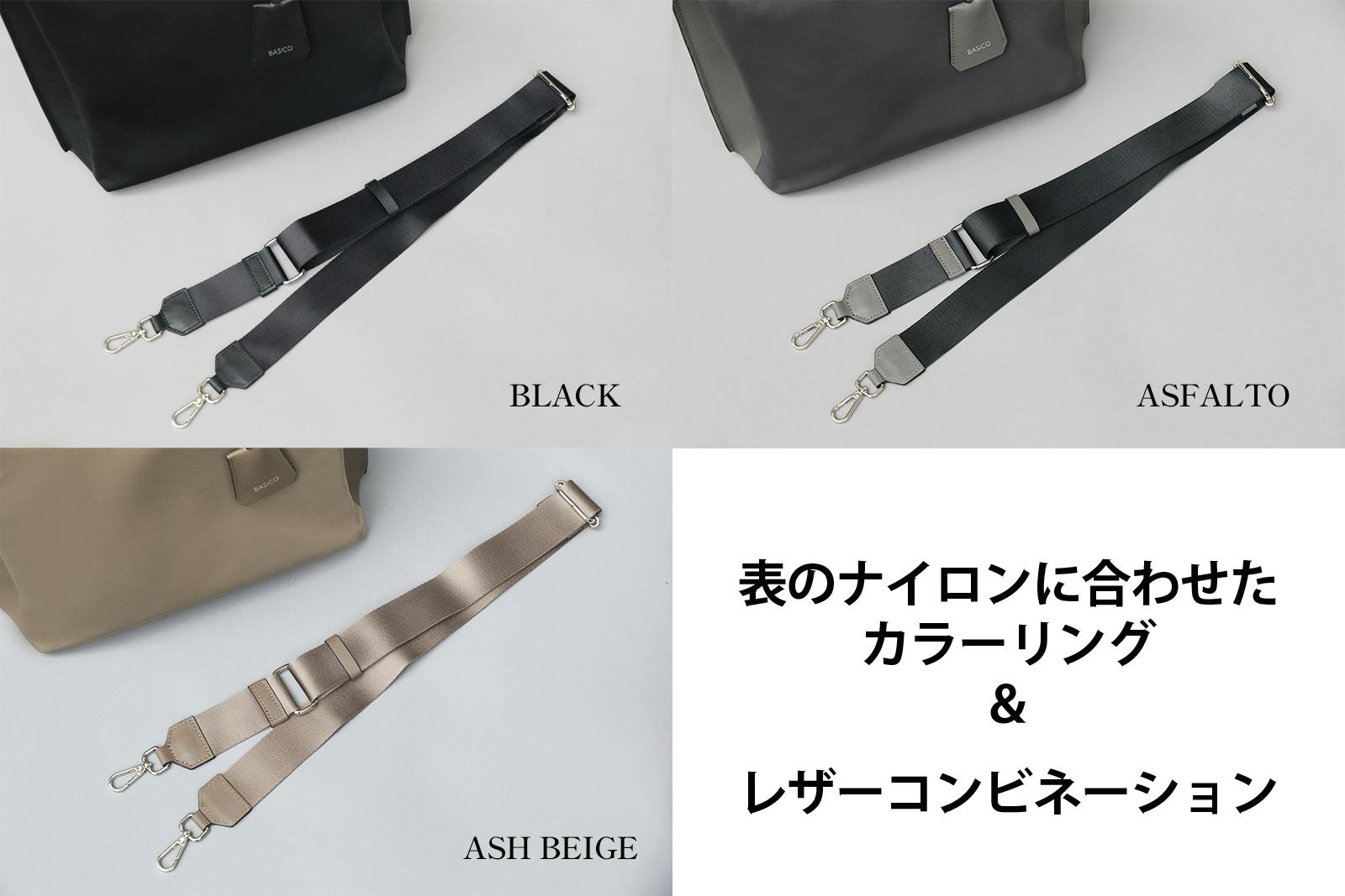 ストラップは、高級車のシートベルトにも使用される素材で作られており、あえて太め(幅4cm)にすることで、体圧を分散、バッグの重さを感じづらくしています。