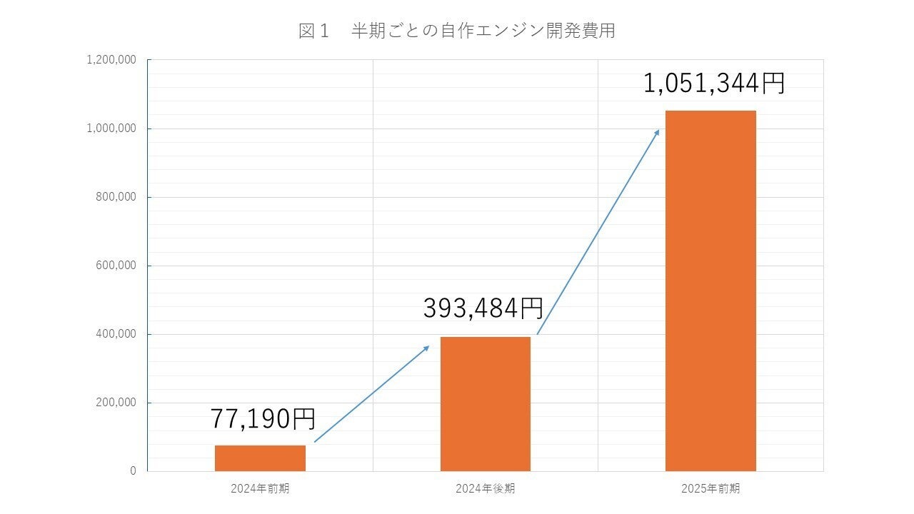 これに加えて、自作エンジンの製作費用も予算を圧迫し、部員内でそれらを賄うことは難しくなって来ており、プロジェクトに暗雲が立ち込めつつあります。図1は半期ごとの自作エンジンの開発費の推移です。
