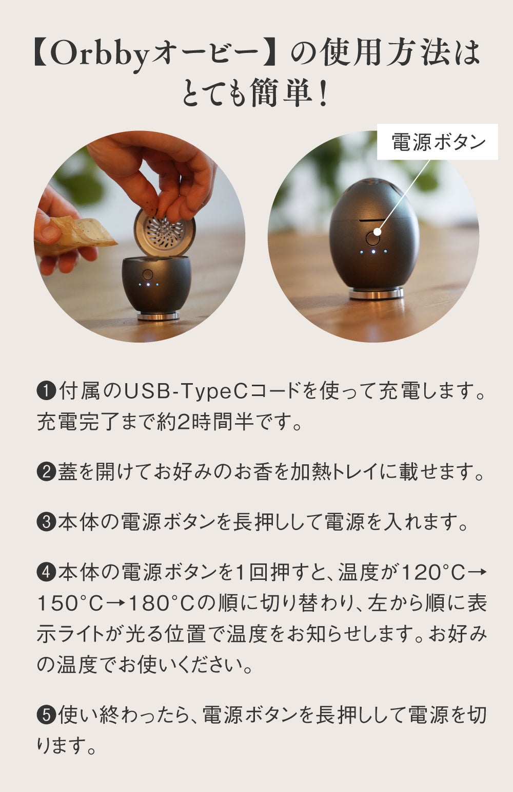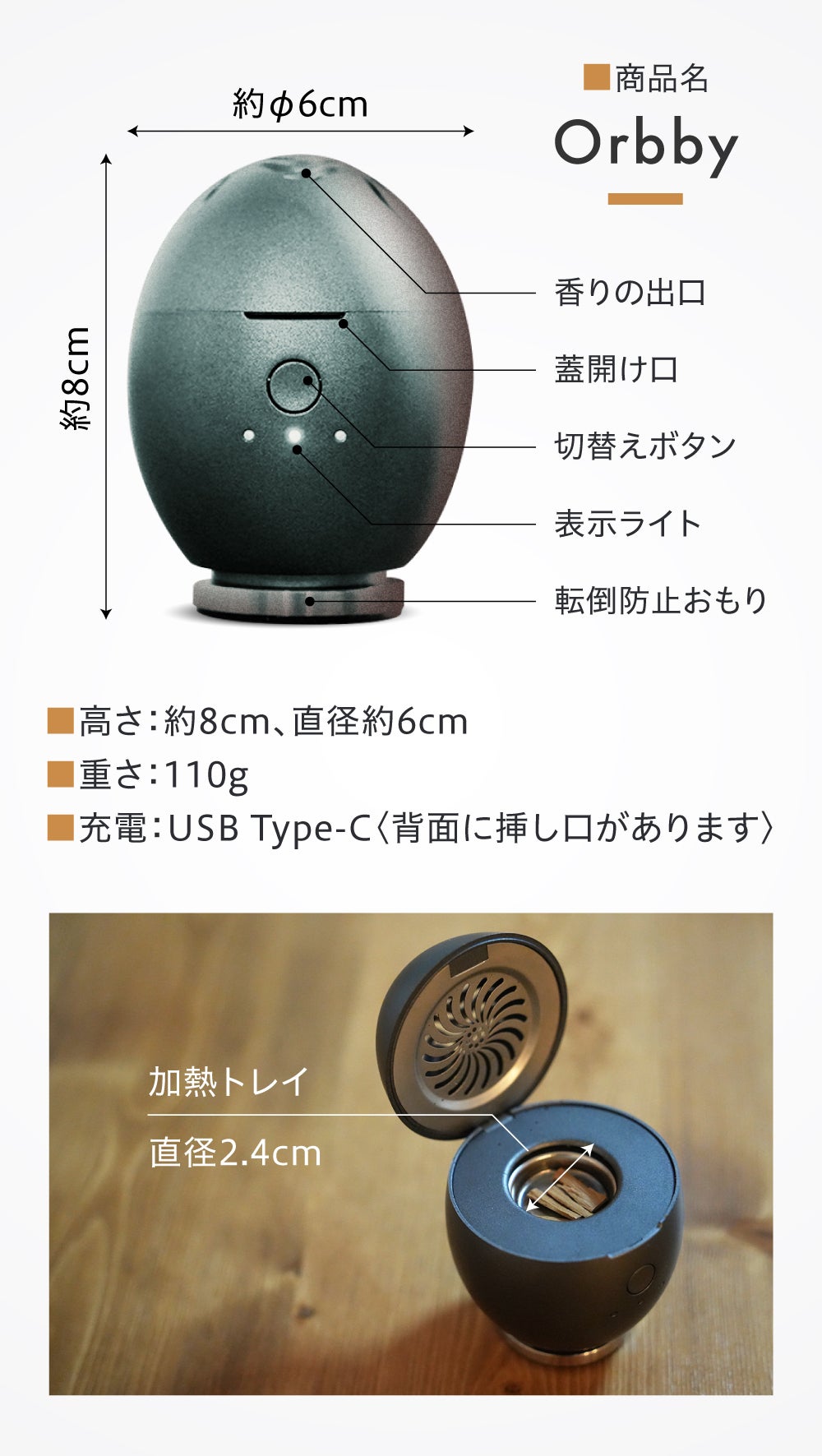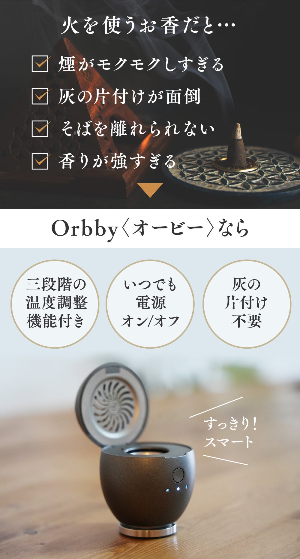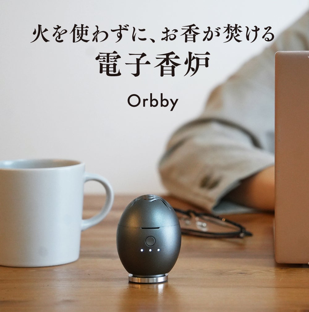 火を使わずにお香を楽しめる、お香をもっと気軽に生活に取り入れる、香りを手軽に楽しめるアイテム Orbby をみなさまにお届けいたします。