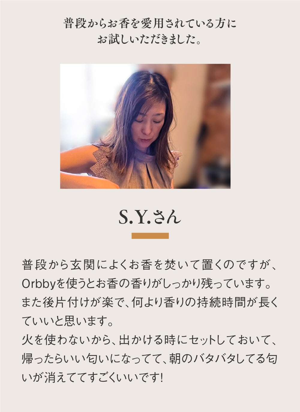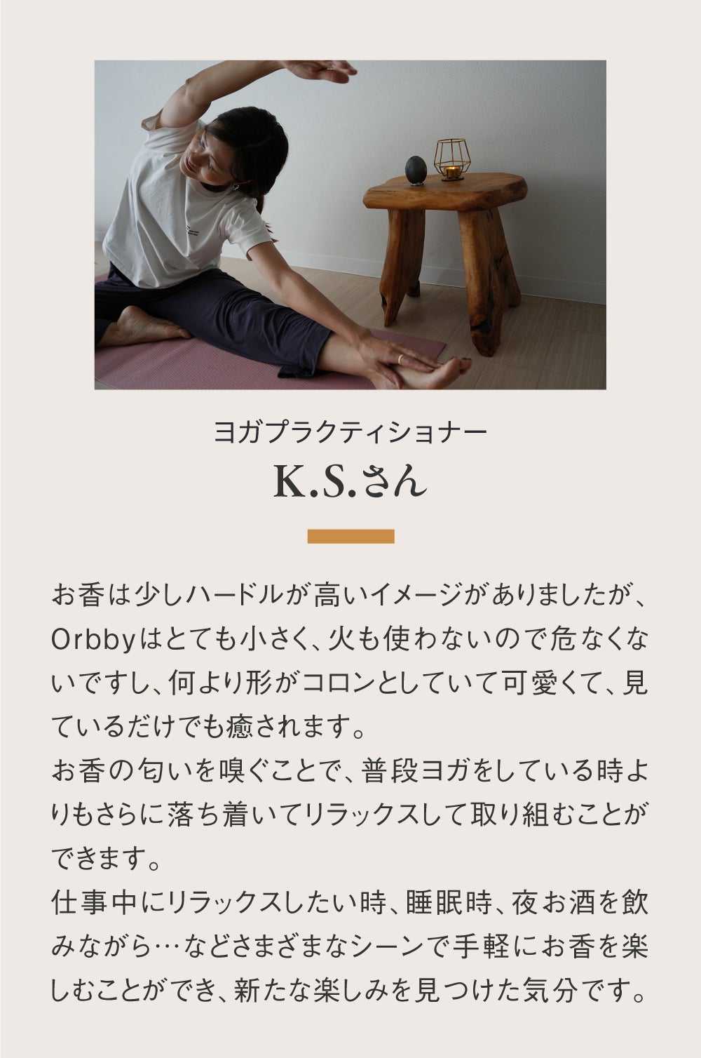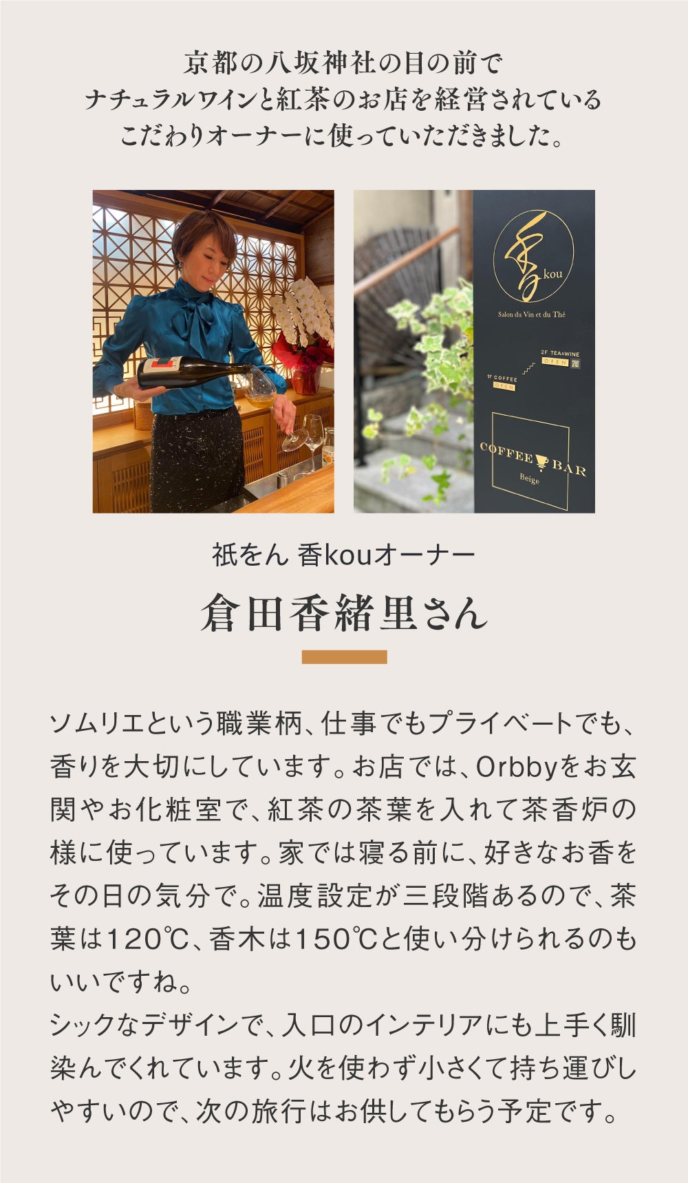 火を使わずにお香を楽しめる、お香をもっと気軽に生活に取り入れる、香りを手軽に楽しめるアイテム Orbby をみなさまにお届けいたします。