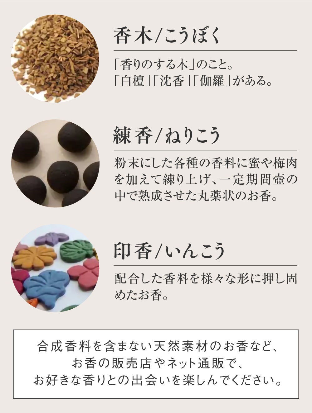 間接的に熱を加えるタイプの「香木(こうぼく)」「練香(ねりこう)」「印香(いんこう)」をお使いください。