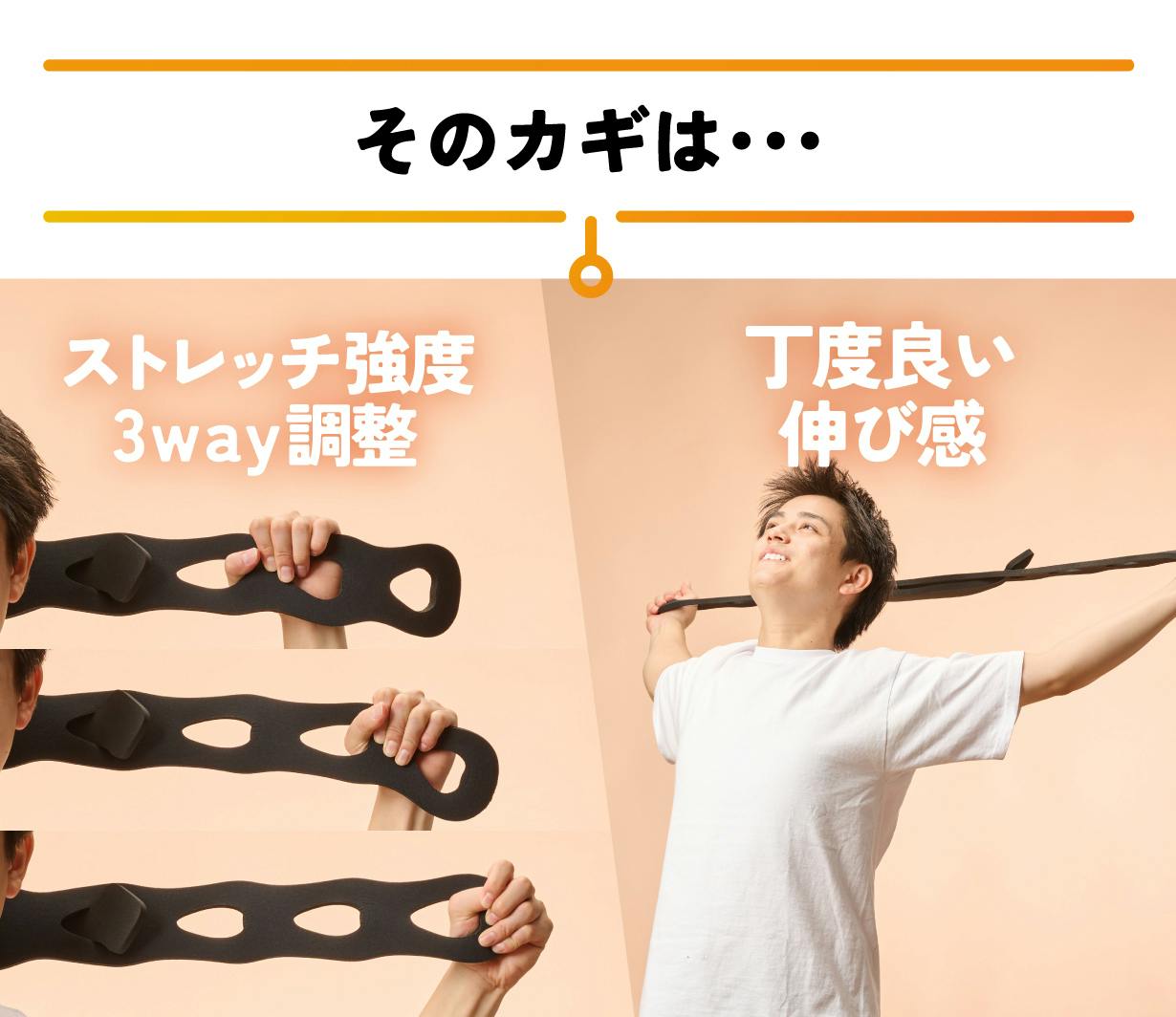 指を掛けられる穴があるので握力など余分な力を入れずにストレッチ!身体の状態に合わせて指を掛ける穴の位置を変えれば、この1本でストレッチの強度を調整することができます。