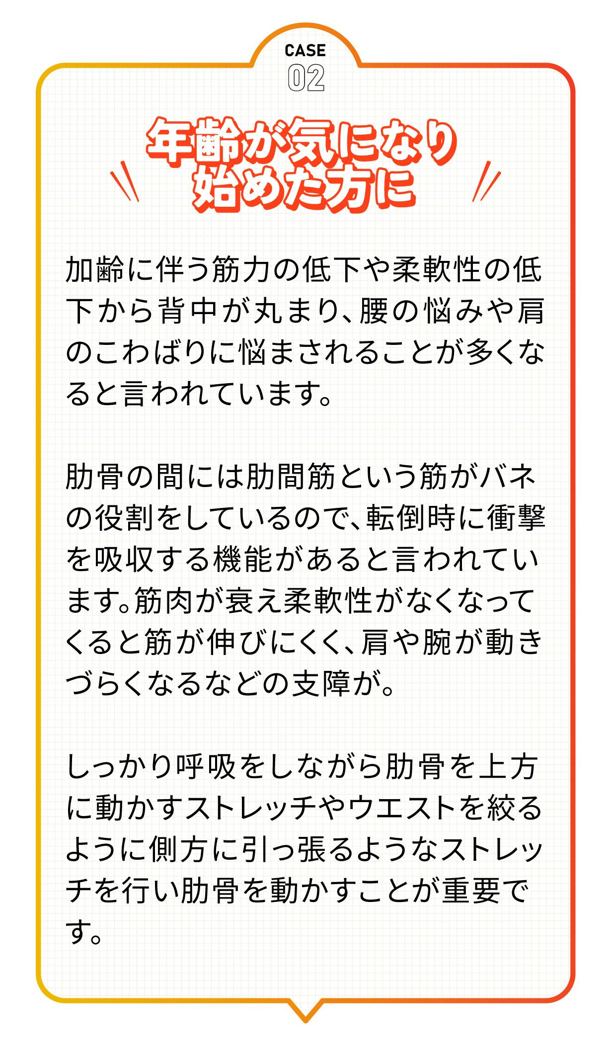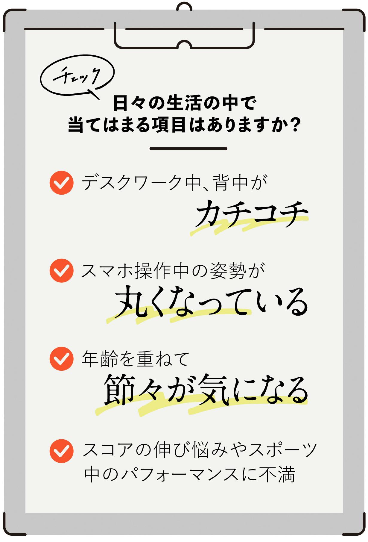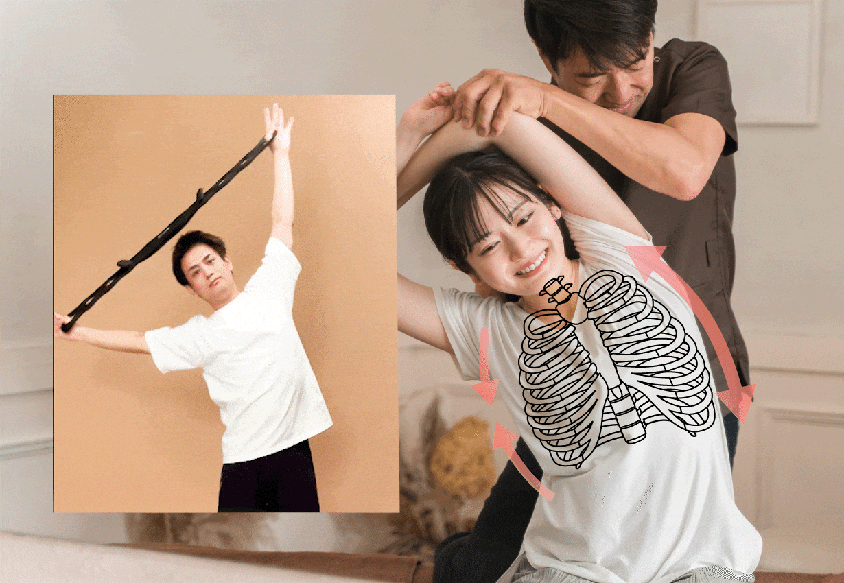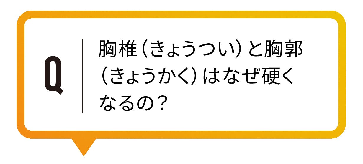 これらの問題は、胸椎(きょうつい)の柔軟性の低下が原因であることが多いといわれています。