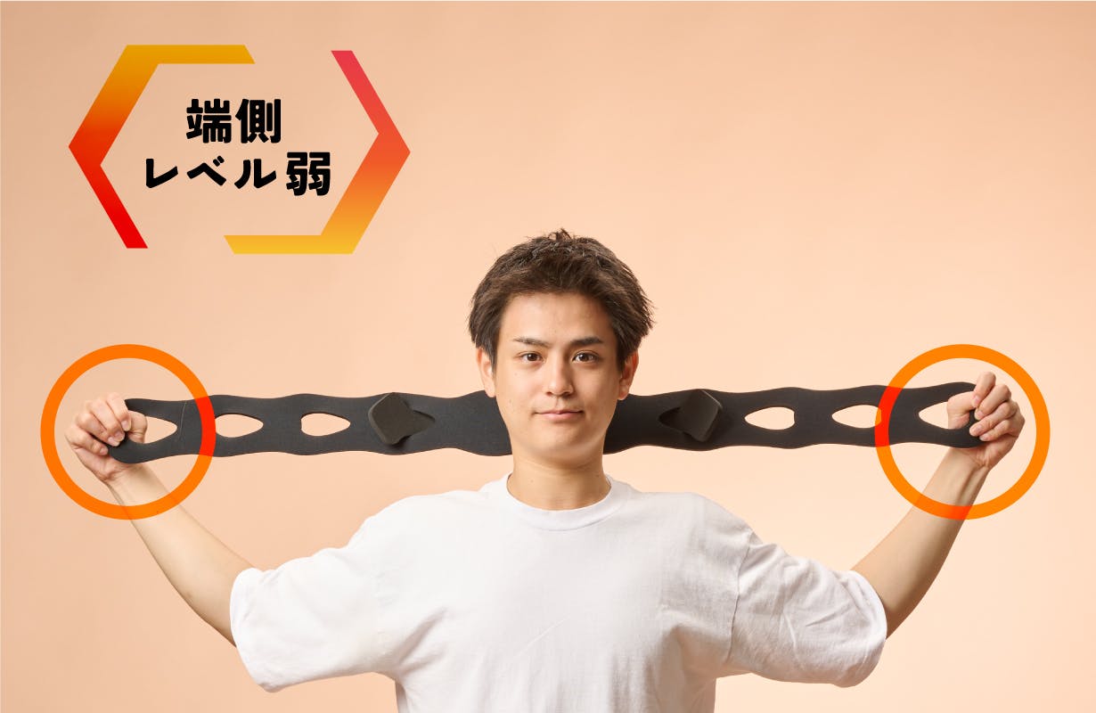 2.傾ける側のバンドを少し強めに引っ張りながら身体を横に傾けます。(左側に身体を倒す場合は左手でバンドを少し強めに引っ張ります)