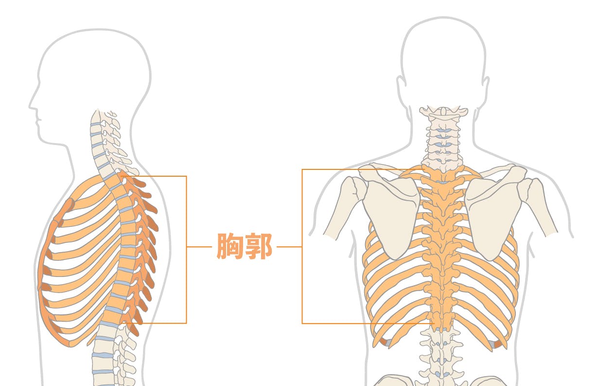 胸郭は、胸椎に加え、12個の肋骨と胸骨で構成され、胴体の上部を囲む構造です。胸郭は上半身の姿勢や体幹を維持し、全身のバランスを取る役割があります。