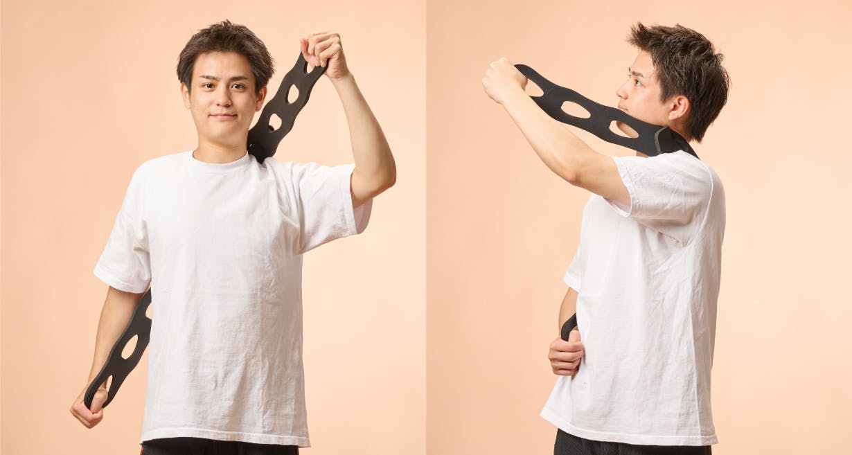 2.肘はなるべく曲げずにバンドを頭の後ろに回します。