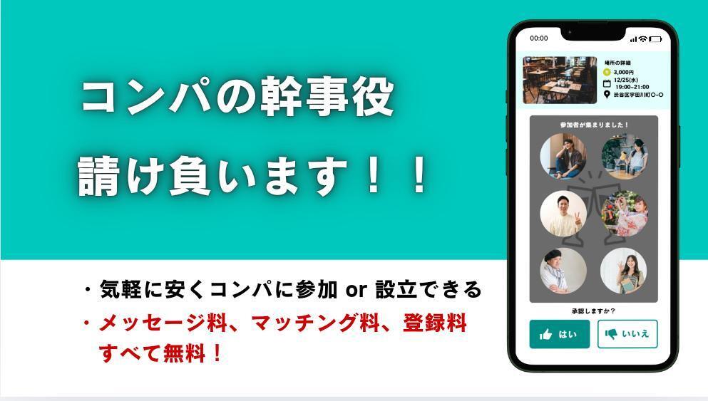 「コンパの幹事役を請け負うアプリ」をキャッチフレーズにアプリ開発を行っており、気軽に楽しく安く人と人が出会える世の中を実現するための仕組みを作っています。これはスマホ時代に求められる新しい対面型エンターテイメントビジネスです。