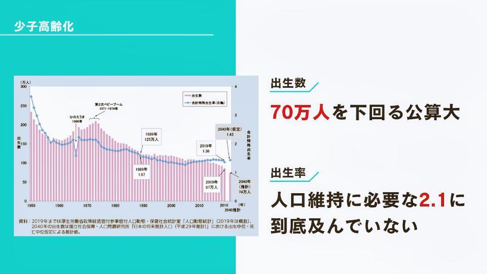 昔は不便だったからこそ皆で出会いを作ろうという風潮がありました。しかし、今はスマホ・SNSが発達して便利になりすぎた結果、「出会いがないのは個人のせい」「恋愛できないのは個人のせい」という出会いの個人主義化が起こってしまっています。これが少子高齢化(スライド参照)、そして現在の出会い不足の根底原因であると考えています。実際に、私は21歳の大学生ですが、出会い盛りの年齢にも関わらず「合コン開こう!」といったような話は殆ど聞きません。