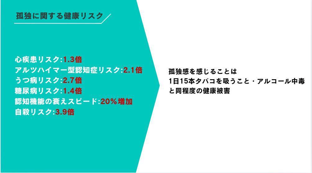 孤独は心身ともに健康リスクがあります(スライド参照)。孤独感を感じることがタバコ1日15本・アルコール中毒と同程度の健康被害という話を知っている人はどれほどいるのでしょうか、実際このようなことは大して認識されていない印象があります。このまま出会いの個人主義化が進行し人が孤立する世の中になっては暗い日本になると思っています。人は社会的動物であり、人と人との出会いこそが人生を豊かにするのです。