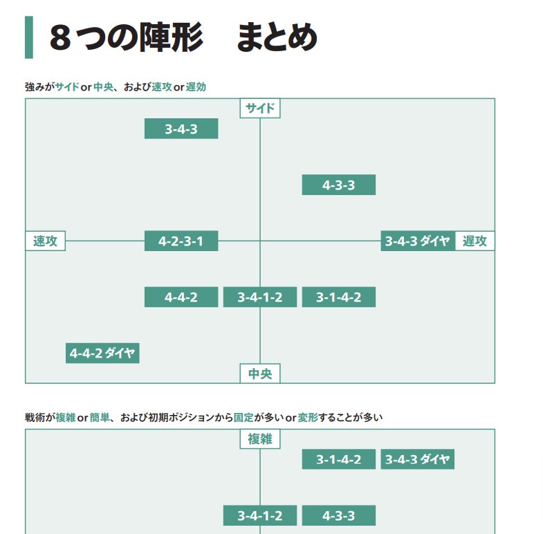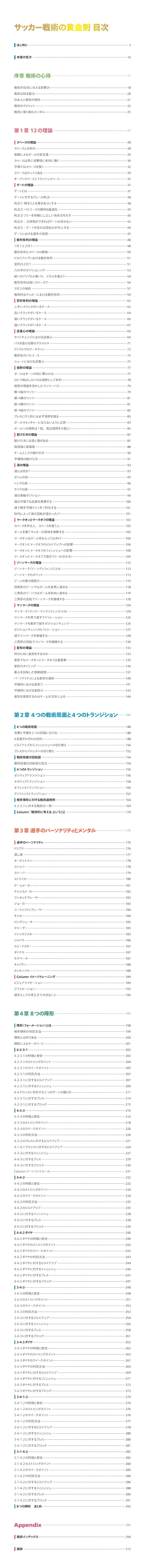 「ゲートの理論」「渦の理論」や「オフェンストランジション」など、サッカーに親しんでいる方でも初めて目にする興味深いキーワードが数多くあると思います。本書のメインディッシュとも言える「8つの陣形」では、各陣形の特徴から4つの戦術局面ごとの攻略方法を解説。また、「選手のパーソナリティとメンタルトレーニング」という読み物や「戦術用語インデックス」も収録した圧巻の320ページは、お腹いっぱいになること間違いなしです。