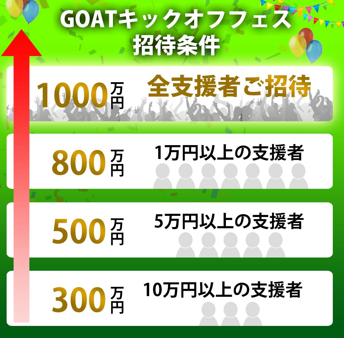 <GOATキックオフフェス詳細>参加者: GOAT、GOAT FC選手、支援額に応じ招待される支援者 - 300万円達成時:10万円以上の支援者