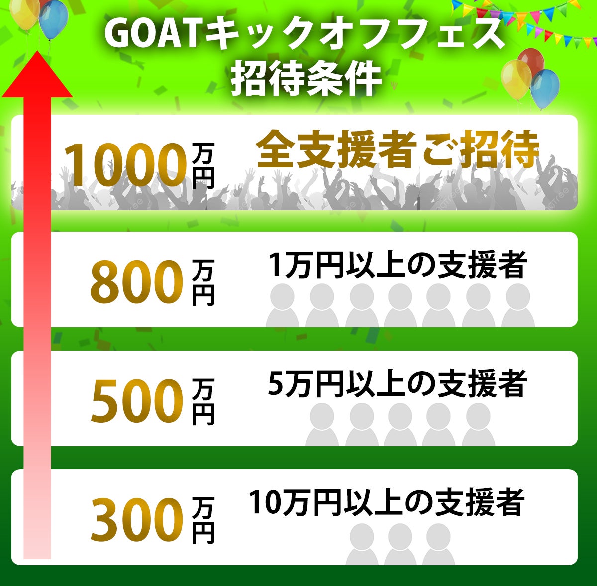 <GOATキックオフフェス詳細>参加者: GOAT、GOAT FC選手、支援額に応じ招待される支援者 - 300万円達成時:10万円以上の支援者