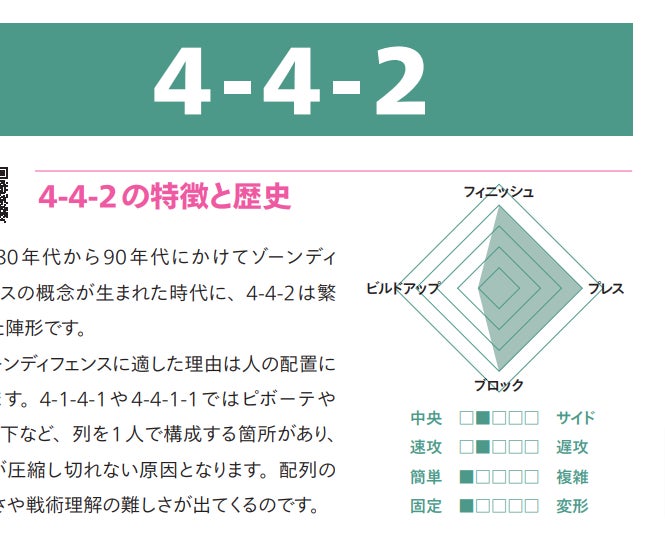 「ゲートの理論」「渦の理論」や「オフェンストランジション」など、サッカーに親しんでいる方でも初めて目にする興味深いキーワードが数多くあると思います。本書のメインディッシュとも言える「8つの陣形」では、各陣形の特徴から4つの戦術局面ごとの攻略方法を解説。また、「選手のパーソナリティとメンタルトレーニング」という読み物や「戦術用語インデックス」も収録した圧巻の320ページは、お腹いっぱいになること間違いなしです。