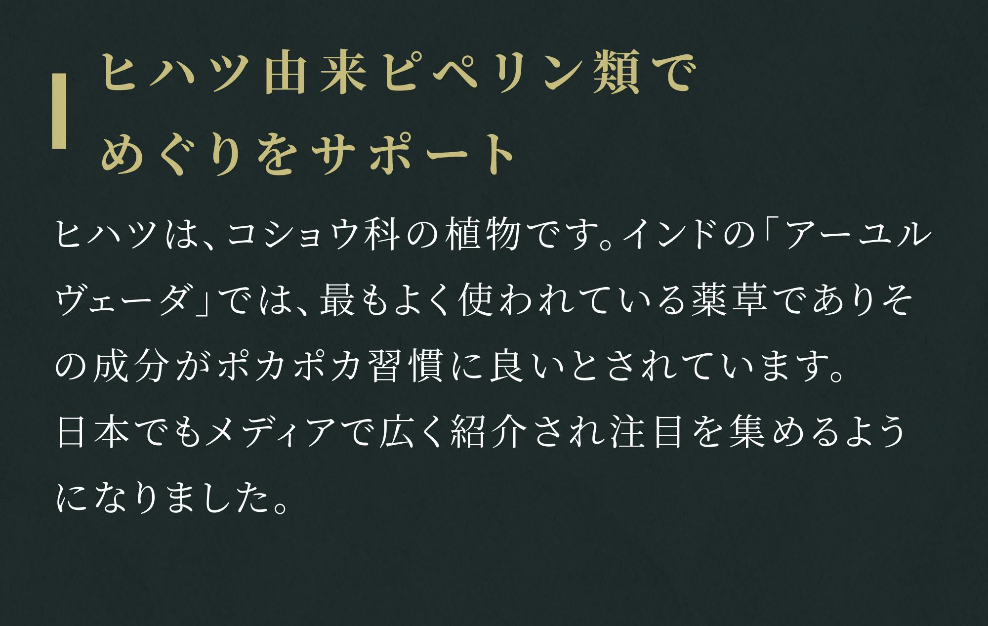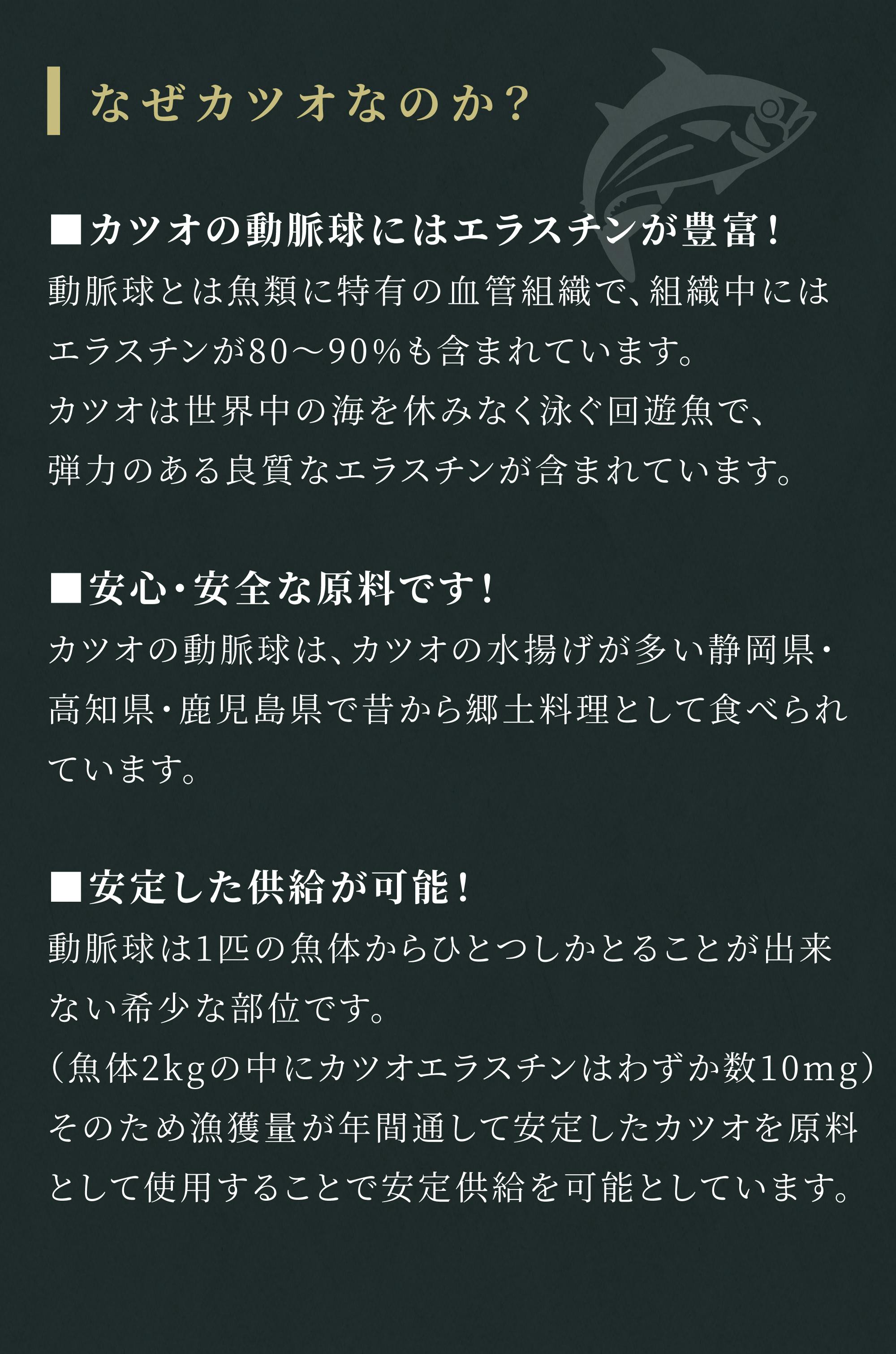 また「カツオエラスチン」と「ヒハツエキス」は、体づくり、ポカポカめぐりをサポートする栄養素が含まれており、毎日を優雅で健やかに過ごしたい方へオススメの有効成分になります。