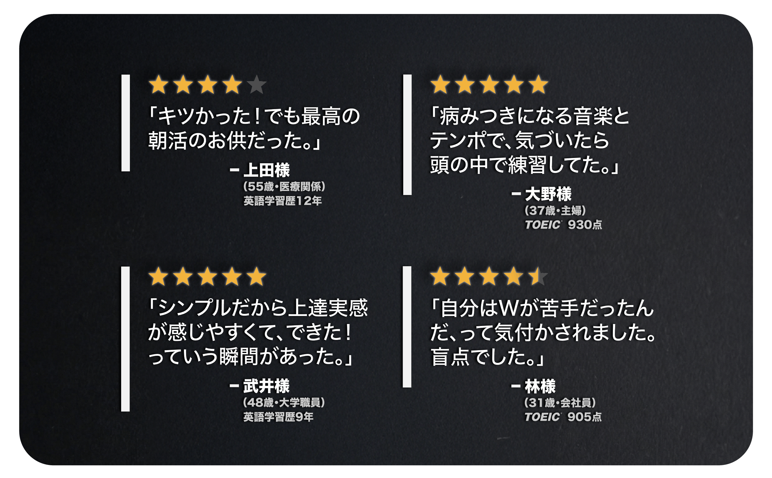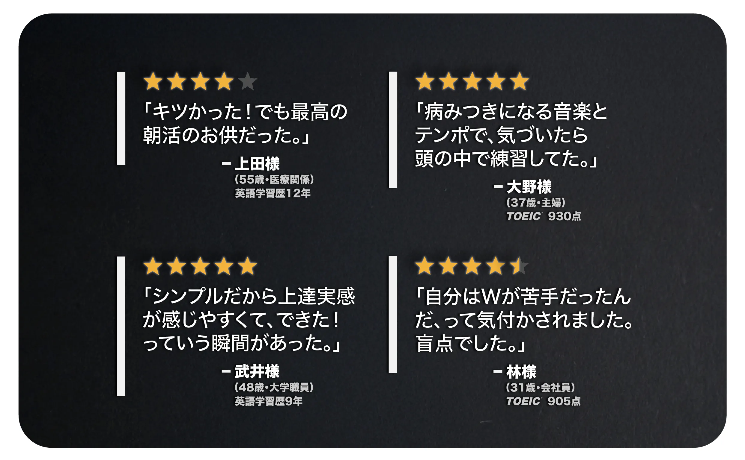 一部のモニターさんからは「ドリルが難しすぎる」とのコメントをいただき、成果が出る前にギブアップしてしまった方もおられます。だからこそ、”Tricky Sounds”のセットに取り組むためにはTOEIC700点(英検2級)程度のお力と覚悟がある方に利用をお勧めしています。