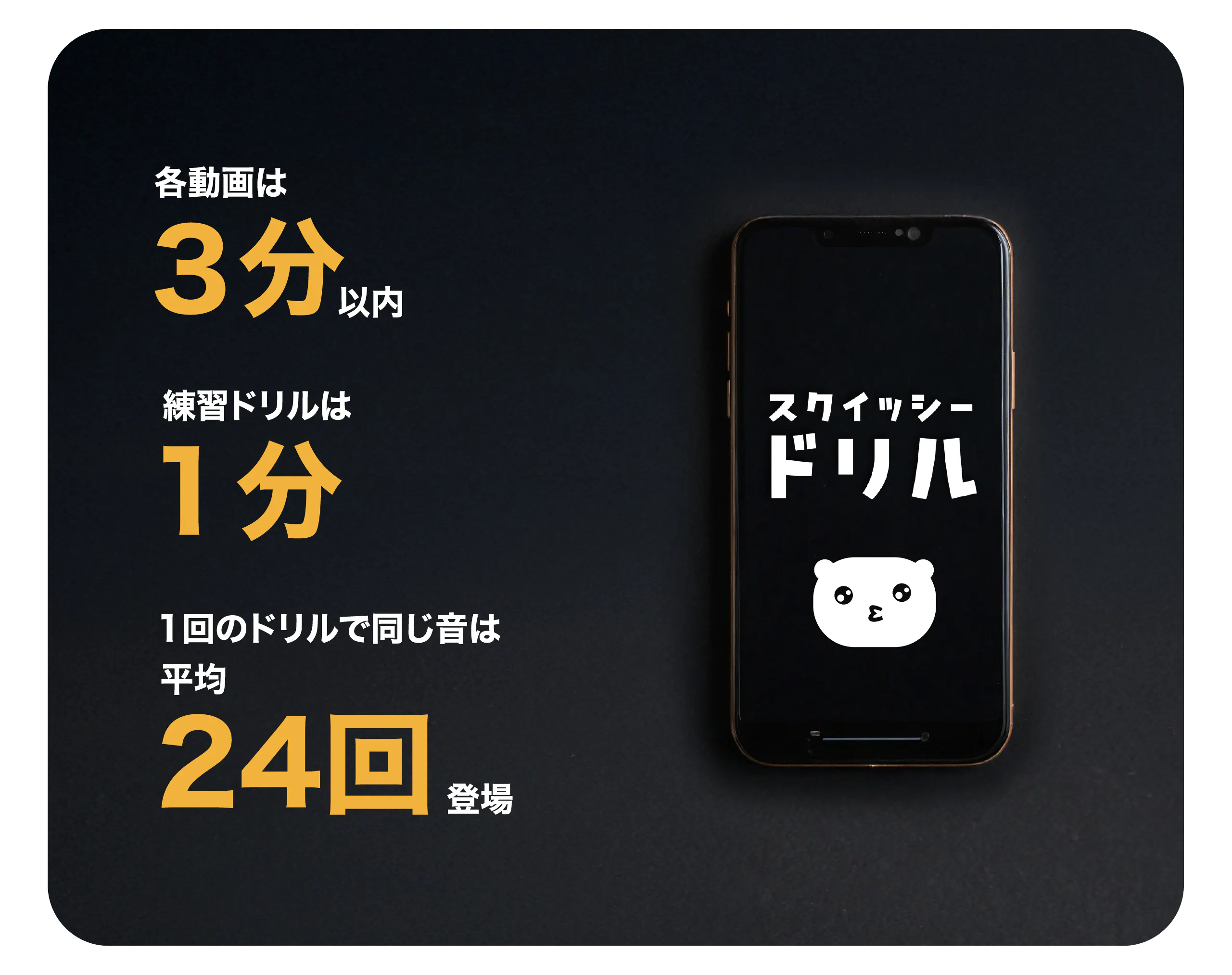 スクイッシードリルは、英語を正しく聞き取るのと同時に自分の発音が正しいのかを自分で判断できるように耳を鍛えながら、英語独特のリズムもつかむことでネイティブのような発音とスムーズな会話が可能になるよう制作されたトレーニング動画です。