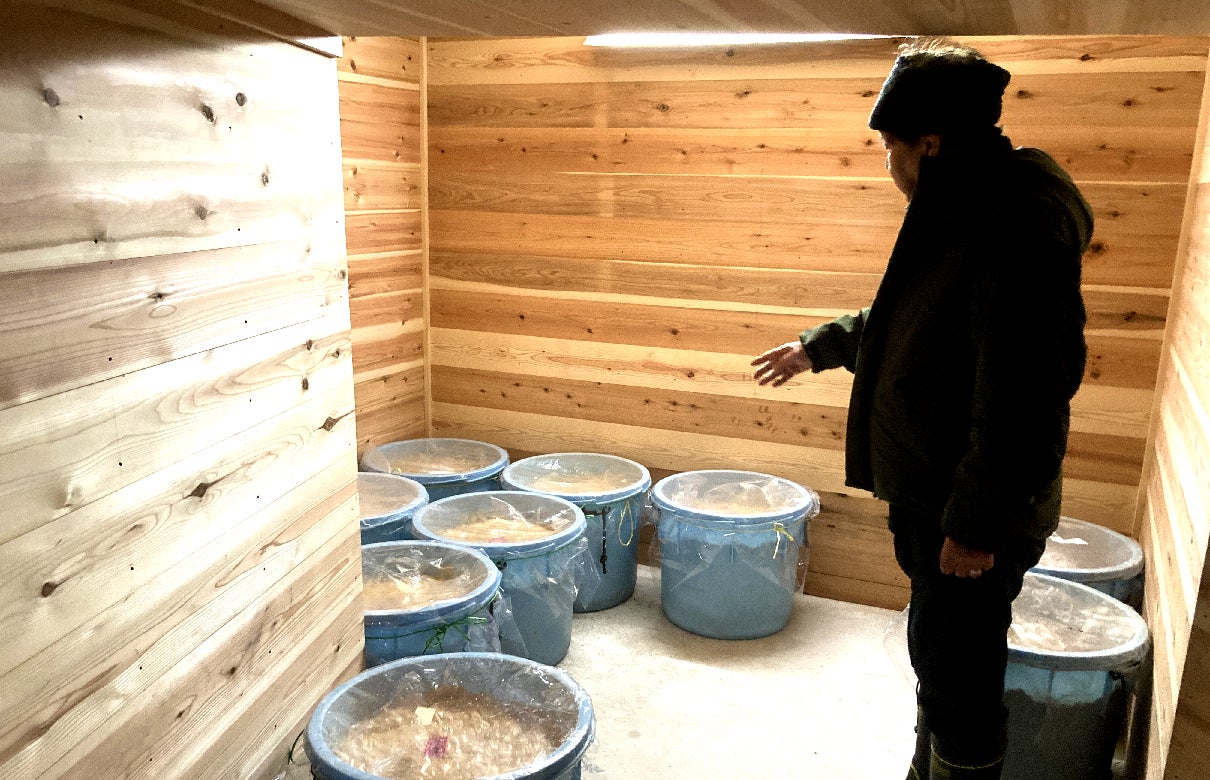 この冬に仕込んだ味噌を、完成した温醸室の一角に置くことができました。みそ蔵が利用できない為まだまだ量は少ないですが、着実に復興へ向けた一歩を踏み出しています。